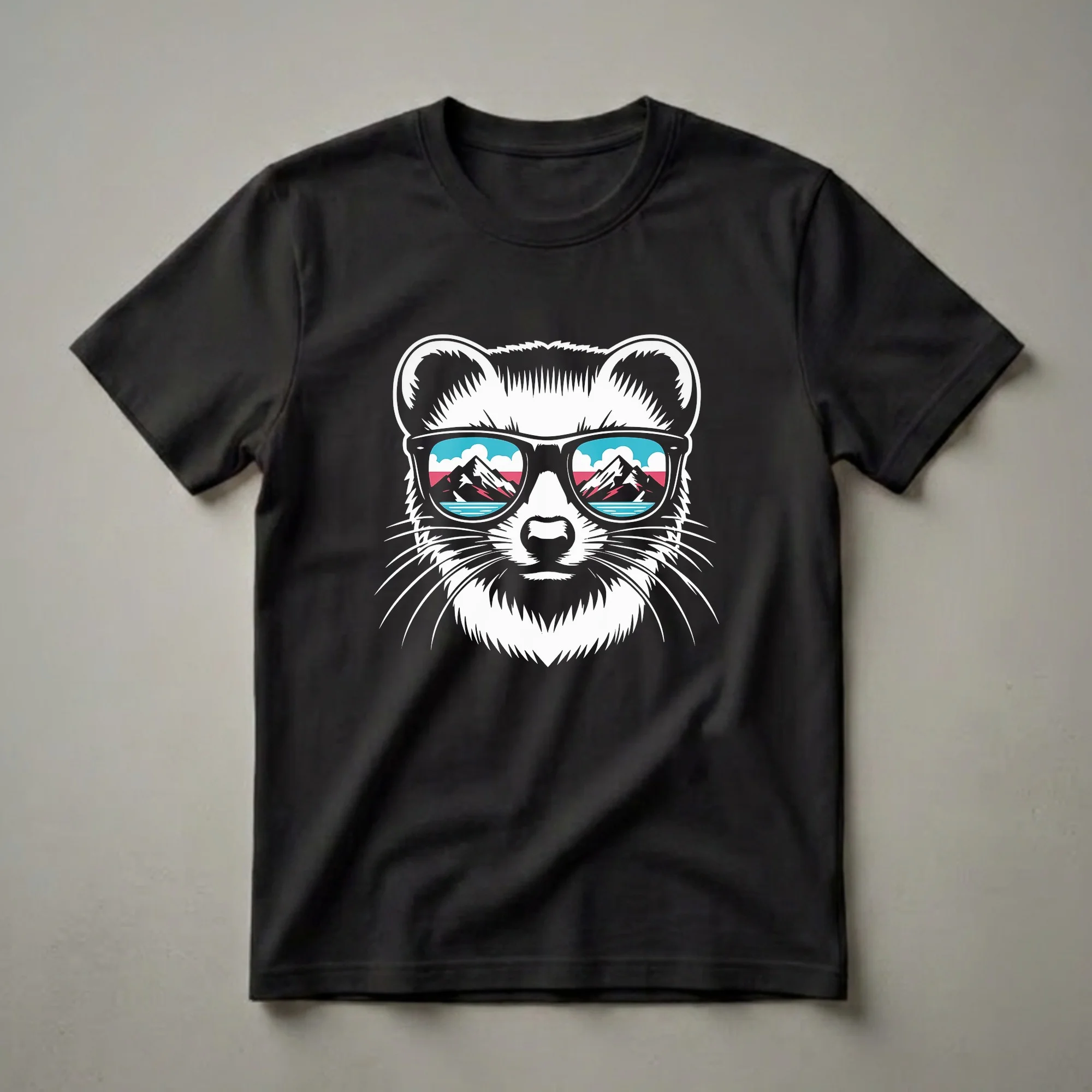 Nature lovers and wildlife fans will reach for this unique graphic tee, showcasing a striking illustration of a weasel sporting stylish sunglasses. The lenses of the sunglasses reflect a vibrant mountain landscape, complete with snow-capped peaks, a serene lake, and a bright blue sky dotted with clouds. Weasels, known for their agility and slender bodies, are found in diverse habitats across the globe, from forests to grasslands, often near water sources. This t-shirt captures the adventurous spirit of these fascinating creatures, making it a go-to tee for anyone who appreciates the great outdoors. It makes a thoughtful gift for hikers, campers, or anyone who enjoys the beauty of the natural world. Wear this shirt on your next outdoor adventure or casual outing to express your connection with wildlife.