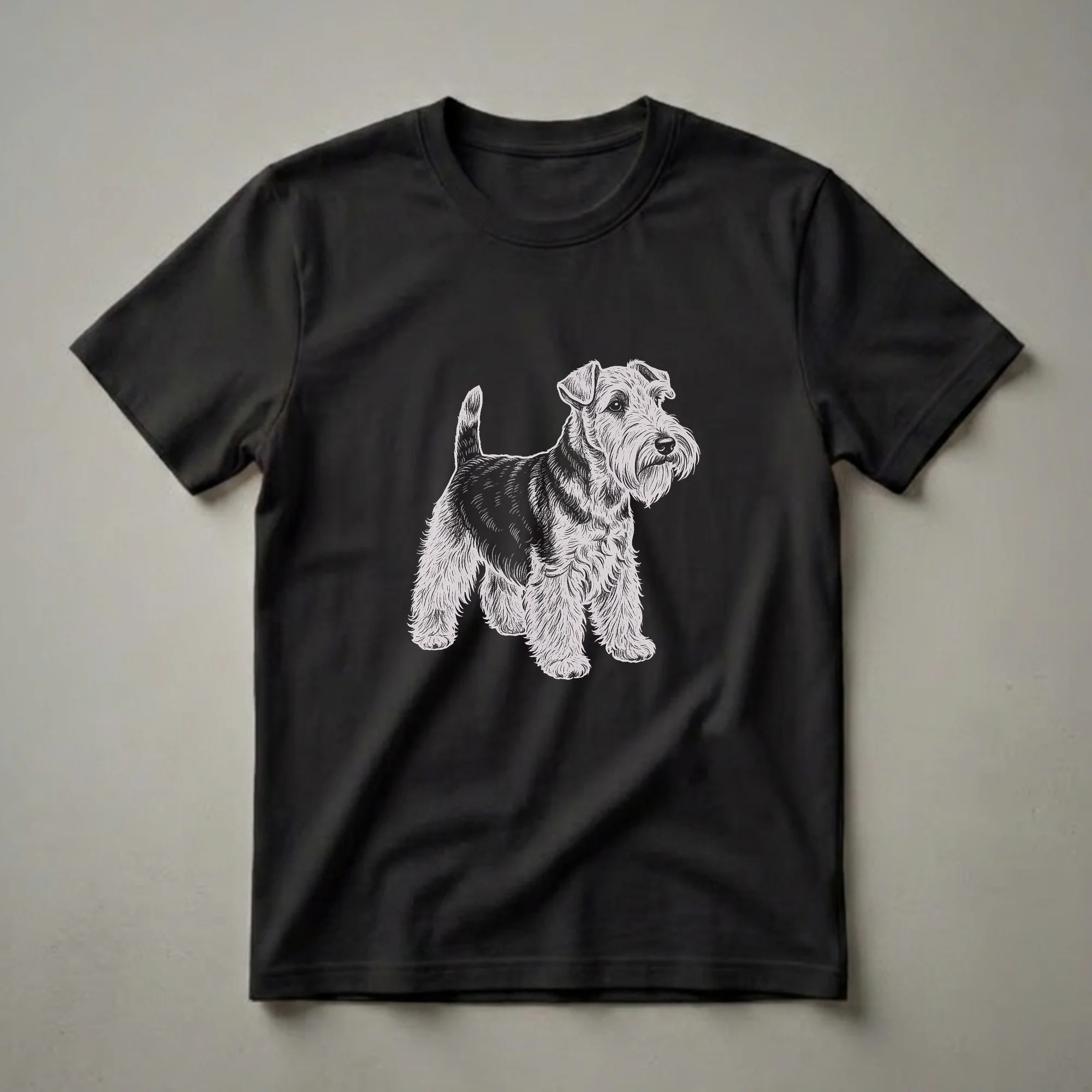 Dog lovers who appreciate minimalist artistry will adore this distinctive line drawing of a spirited Welsh Terrier. This graphic tee features a detailed line drawing of a Welsh Terrier, capturing its alert stance and characteristic beard. The art style uses fine lines to create texture and depth, making the dog stand out against the dark background. Welsh Terriers, originating from Wales, were historically used for fox hunting, showcasing their bravery and tenacity. This shirt is a thoughtful gift for any dog mom or dog dad who cherishes their Welsh Terrier. It's a staple in the collection for those who appreciate unique dog art and want to wear their passion. This tee works well for casual outings, dog park visits, or simply relaxing at home with your furry friend. Celebrate the unique charm of the Welsh Terrier with this eye-catching apparel. This shirt makes a wonderful present for birthdays or holidays, ensuring your loved one can proudly display their affection for this remarkable breed.