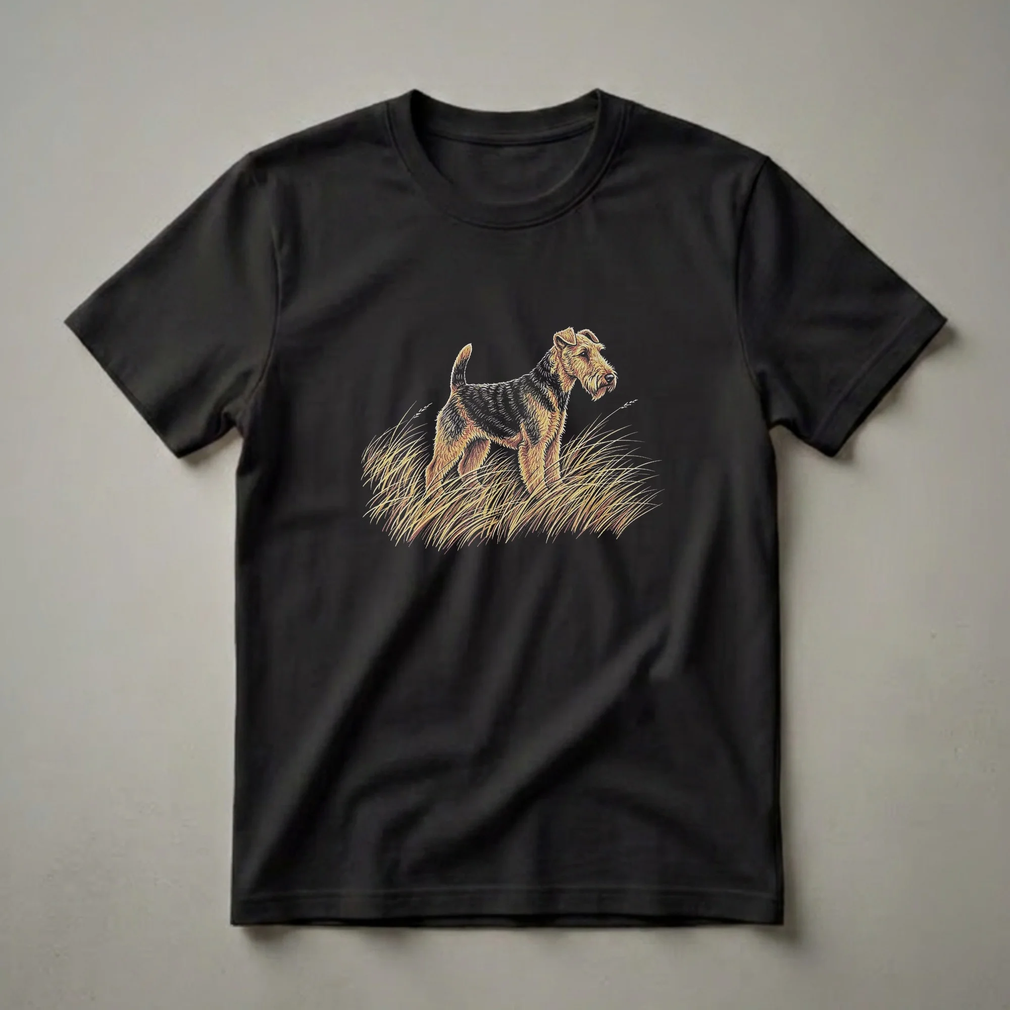 Fellow Welsh Terrier enthusiasts will adore this artistic t-shirt showcasing a beautifully rendered drawing of their favorite spirited breed. This eye-catching t-shirt features a detailed drawing of a Welsh Terrier standing alertly amidst tall, golden grass, capturing the dog's characteristic alert stance and textured fur. The Welsh Terrier, originating from Wales, is known for its lively and affectionate nature, often described as a fearless and friendly companion. This breed was historically used for hunting vermin, showcasing their tenacity and intelligence. This graphic tee is a wonderful way for any Welsh Terrier mom or dad to express their affection for their four-legged family member. It makes a thoughtful gift for birthdays, holidays, or just because. Imagine wearing this shirt to your next dog park visit or a casual outing with fellow dog enthusiasts. This unique apparel celebrates the charm and character of the Welsh Terrier, making it a go-to tee for breed aficionados. This shirt is a fantastic way to show off your pride in this distinctive breed.