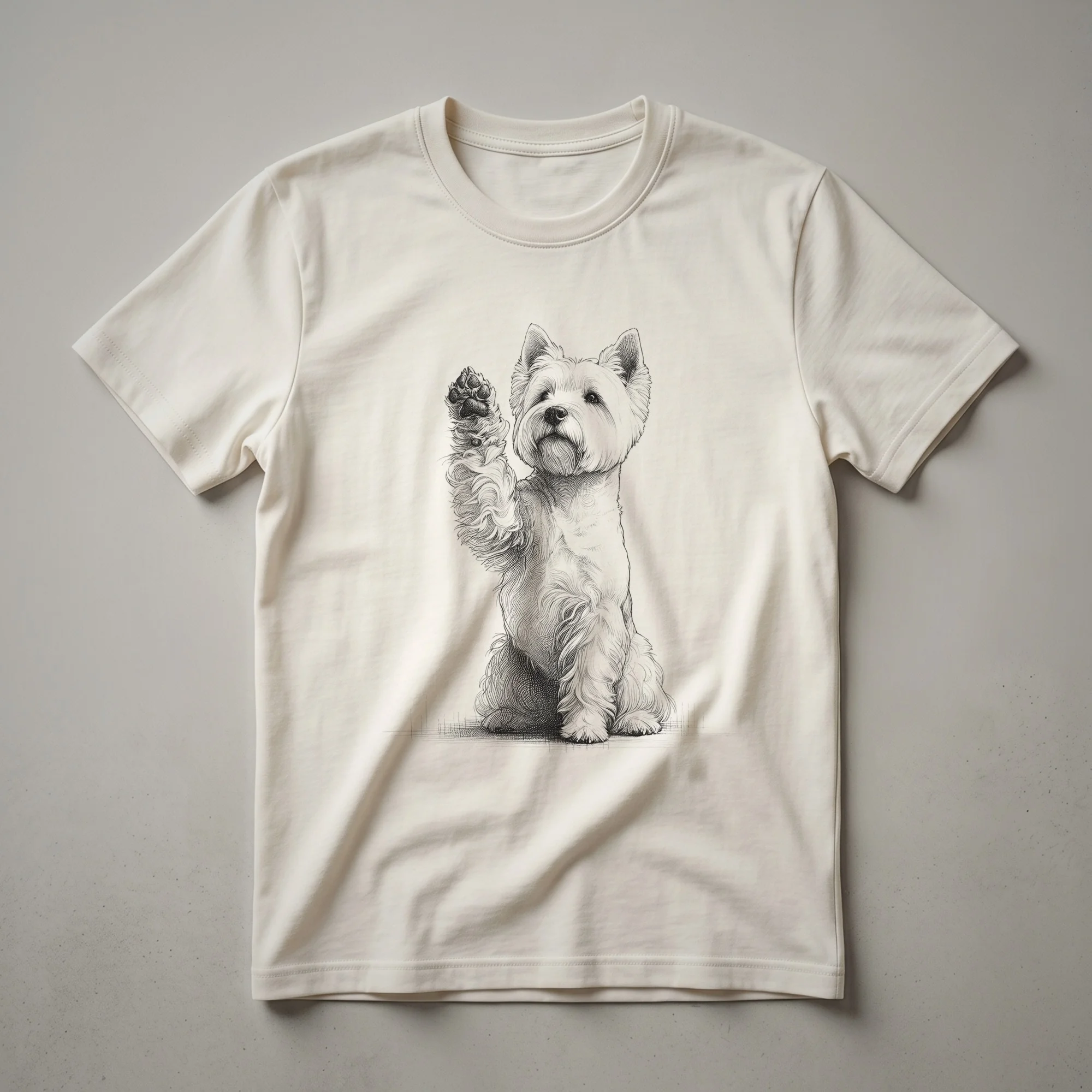 Celebrate your beloved West Highland White Terrier with this charming graphic tee, featuring a playful pup lifting a paw in greeting.This graphic t-shirt captures that charm with a stylized illustration of a Westie raising its paw. The design is rendered in a clean, modern style, making it a standout piece for any dog enthusiast. Westies, originating from Scotland, are known for their confidence and playful nature, often described as having a big dog personality in a small package. This tee is a wonderful way for any Westie mom or dad to express their affection for their beloved companion. It makes a thoughtful gift for birthdays, holidays, or just because. Wear this shirt to your next dog park visit, a casual outing with friends, or while relaxing at home with your furry best friend. It's a staple in the collection for anyone who cherishes their West Highland White Terrier.