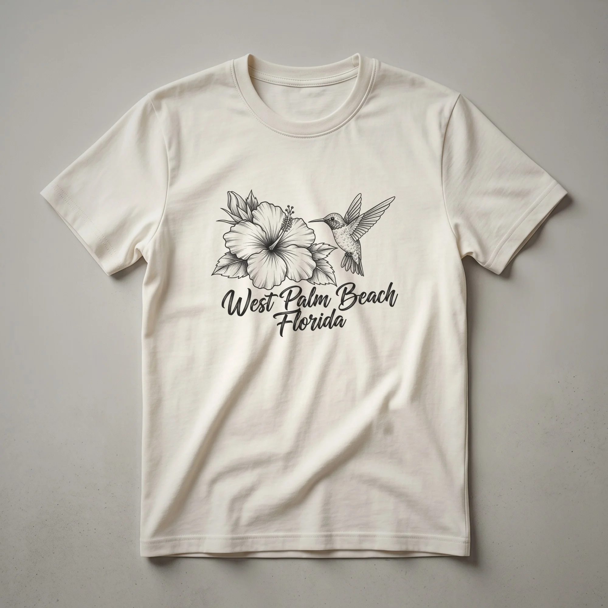 - West Palm Beach sketch art tee featuring a hibiscus and hummingbird.