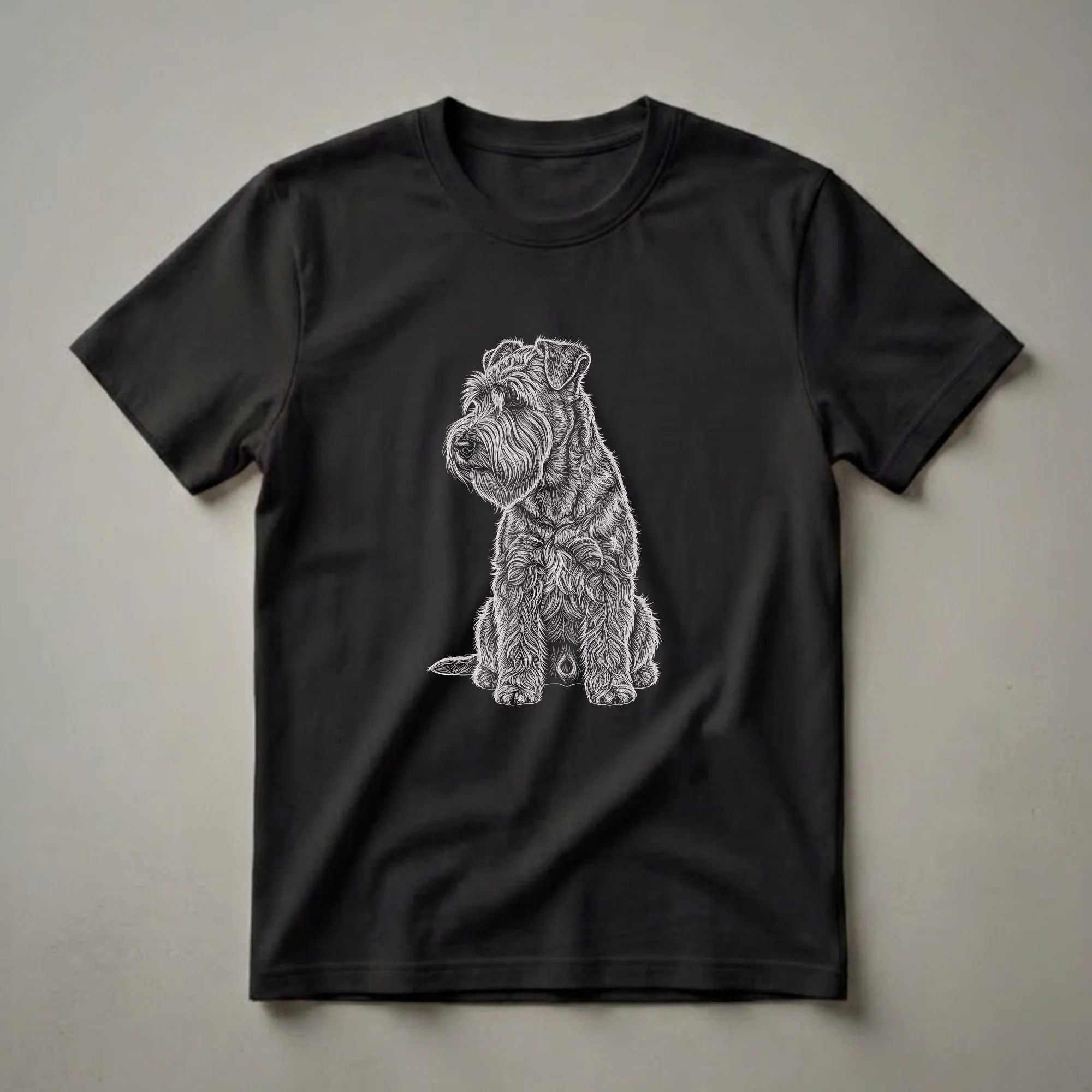 Wheaten Terrier owners know the breed's joyful spirit and distinctive wiry coat. This eye-catching graphic tee features a detailed, vintage-style line drawing of a Wheaten Terrier, rendered in white against a solid black background. The artwork captures the dog's characteristic shaggy fur and alert expression, making it a standout piece for any canine enthusiast. The Wheaten Terrier, originating from Ireland, was historically used as an all-purpose farm dog, adept at hunting vermin and herding livestock. Their energetic and friendly nature makes them a beloved companion. This shirt is a thoughtful gift for the Wheaten Terrier mom or dad who cherishes their furry friend. It's a go-to tee for casual outings, dog park visits, or simply relaxing at home. Wear this unique t-shirt to express your affection for this wonderful breed and spark conversations with fellow dog lovers. The intricate detail of the drawing highlights the breed's unique texture and charm, making it a true piece of wearable art for anyone who appreciates the loyalty and personality of their Wheaten Terrier.