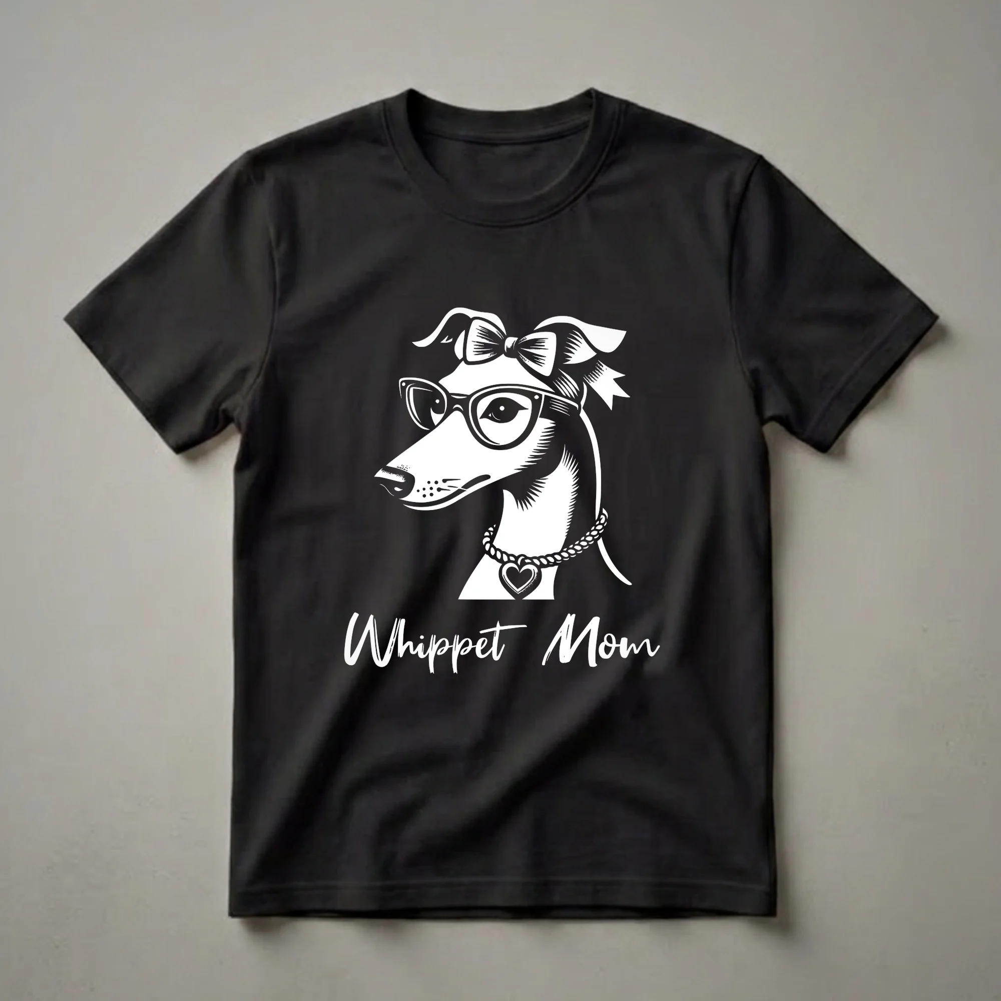 Whippet moms know the unique charm and elegance of their sighthound companions. This graphic tee captures that special bond with a striking black and white illustration. The design features a sophisticated Whippet, complete with a chic bow and glasses, adorned with a heart pendant necklace. Below the artwork, the phrase 'Whippet Mom' is written in a stylish, flowing script, clearly identifying the wearer's proud title. Whippets, known for their speed and gentle nature, are a beloved breed that inspires deep affection. This shirt is a wonderful way for any woman who cherishes her Whippet to express her love for her canine family member. It makes a thoughtful gift for a birthday, holiday, or just because for the Whippet mom in your life. Wear this comfortable tee to your next dog park visit, casual outing, or while relaxing at home with your beloved sighthound. It's a staple in the collection for any dedicated Whippet owner.