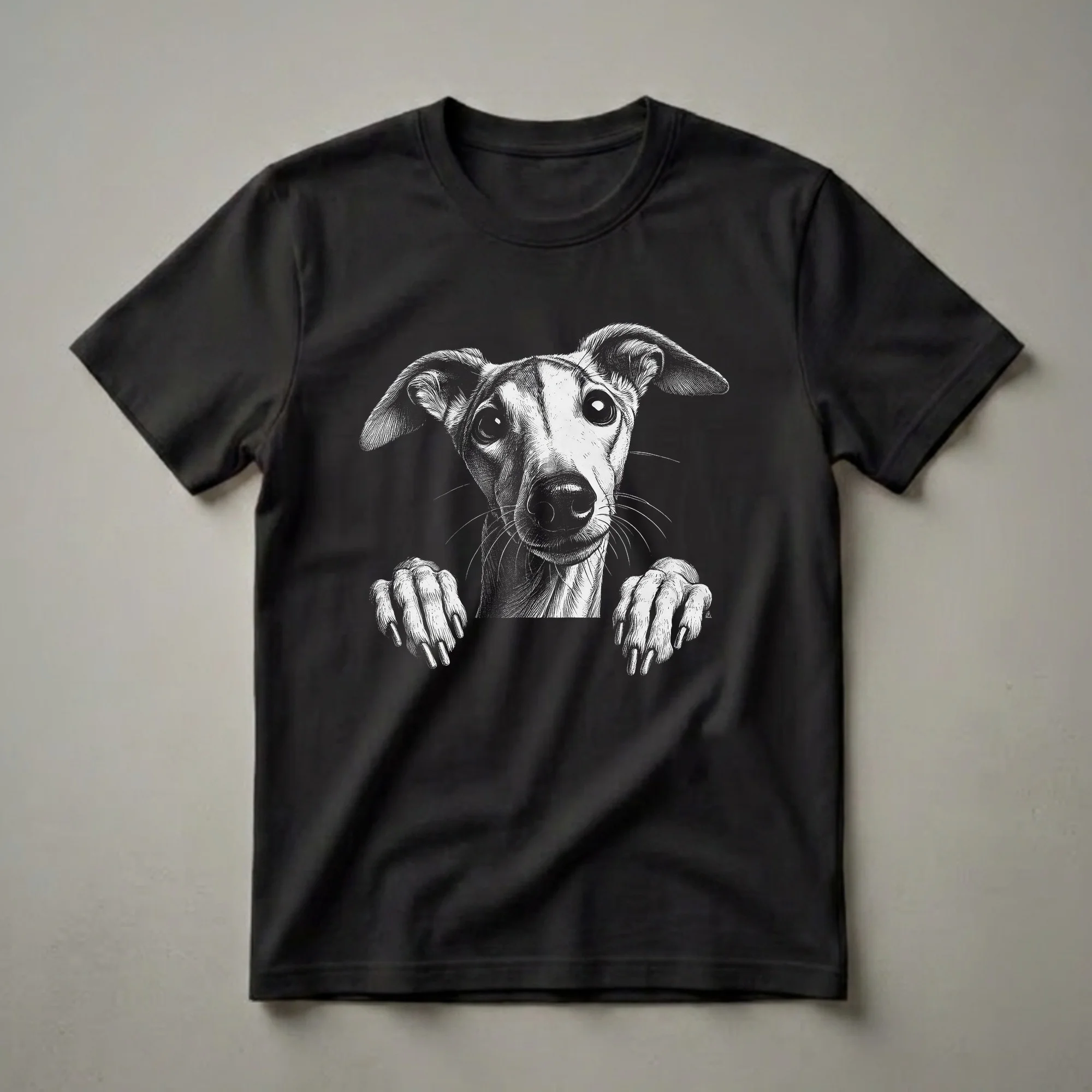 Whippet lovers will adore this t-shirt showcasing a charming scratchboard illustration of their beloved sighthound peeking out with curious paws. This striking graphic tee features a detailed scratchboard illustration of a whippet peeking over a surface, with its paws resting in the foreground. The intricate linework captures the breed's expressive eyes and delicate features, making it a standout piece for any dog enthusiast. Whippets, known for their speed and affectionate personalities, make wonderful companions. This shirt is a thoughtful gift for the whippet mom or dad who cherishes their furry friend. Wear this unique t-shirt to your next dog park visit or casual outing to spark conversations with fellow dog lovers. It's a staple in the collection for anyone who appreciates the charm of this graceful breed. This apparel is a go-to tee for daily wear.