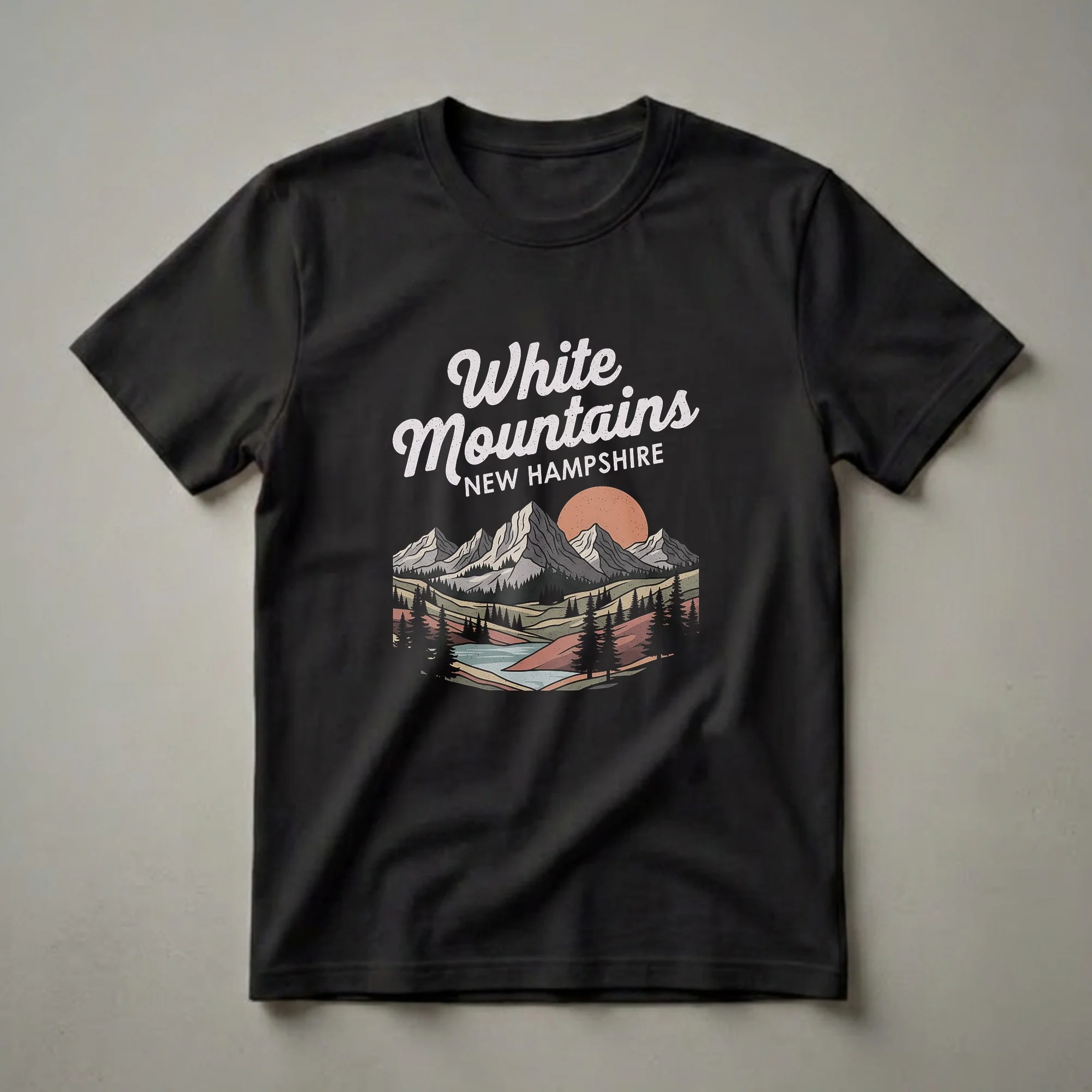 New Hampshire's White Mountains are a stunning natural playground, and this graphic tee captures their rugged beauty. The design features a stylized landscape with jagged mountain peaks, rolling hills dotted with pine trees, and a serene lake reflecting the warm hues of a setting sun. The text "White Mountains NEW HAMPSHIRE" is rendered in a classic retro font, evoking a sense of nostalgia for outdoor adventures. This t-shirt is a thoughtful gift for anyone who has explored the trails of the Presidential Range or simply cherishes the scenic vistas of New England. It's a go-to tee for casual outings, hiking trips, or simply relaxing and reminiscing about mountain getaways. Wear this shirt to celebrate your connection to the Granite State's iconic mountain range and its breathtaking natural scenery. The White Mountains are part of the larger Appalachian Mountain system, known for their challenging terrain and spectacular views, making this shirt a symbol of adventure and appreciation for the outdoors.