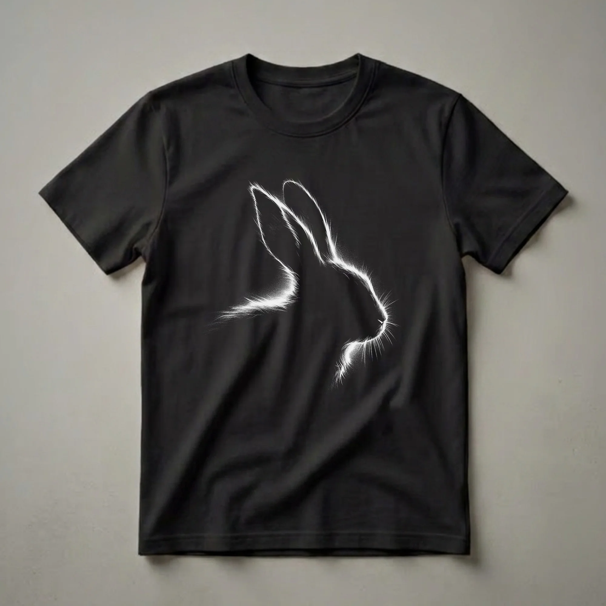 Bunny lovers will adore this unique graphic tee featuring a striking white outline of a rabbit's head. The artwork uses a spray-paint effect with wispy, energetic lines to capture the soft texture of fur and the alert posture of the animal. Rabbits are known for their gentle nature and quick movements, making them captivating companions. This t-shirt is a wonderful way for rabbit owners, whether they care for a pet bunny at home or appreciate them in the wild, to express their affection. It makes a thoughtful gift for anyone who finds joy in these charming creatures. Wear this shirt to casual outings, to the park, or while relaxing at home, and let your passion for rabbits shine. This eye-catching design is a staple for any animal lover's wardrobe, offering a stylish nod to these beloved farm and domestic animals. The graphic stands out vividly against the dark background, ensuring it catches the eye of fellow enthusiasts.