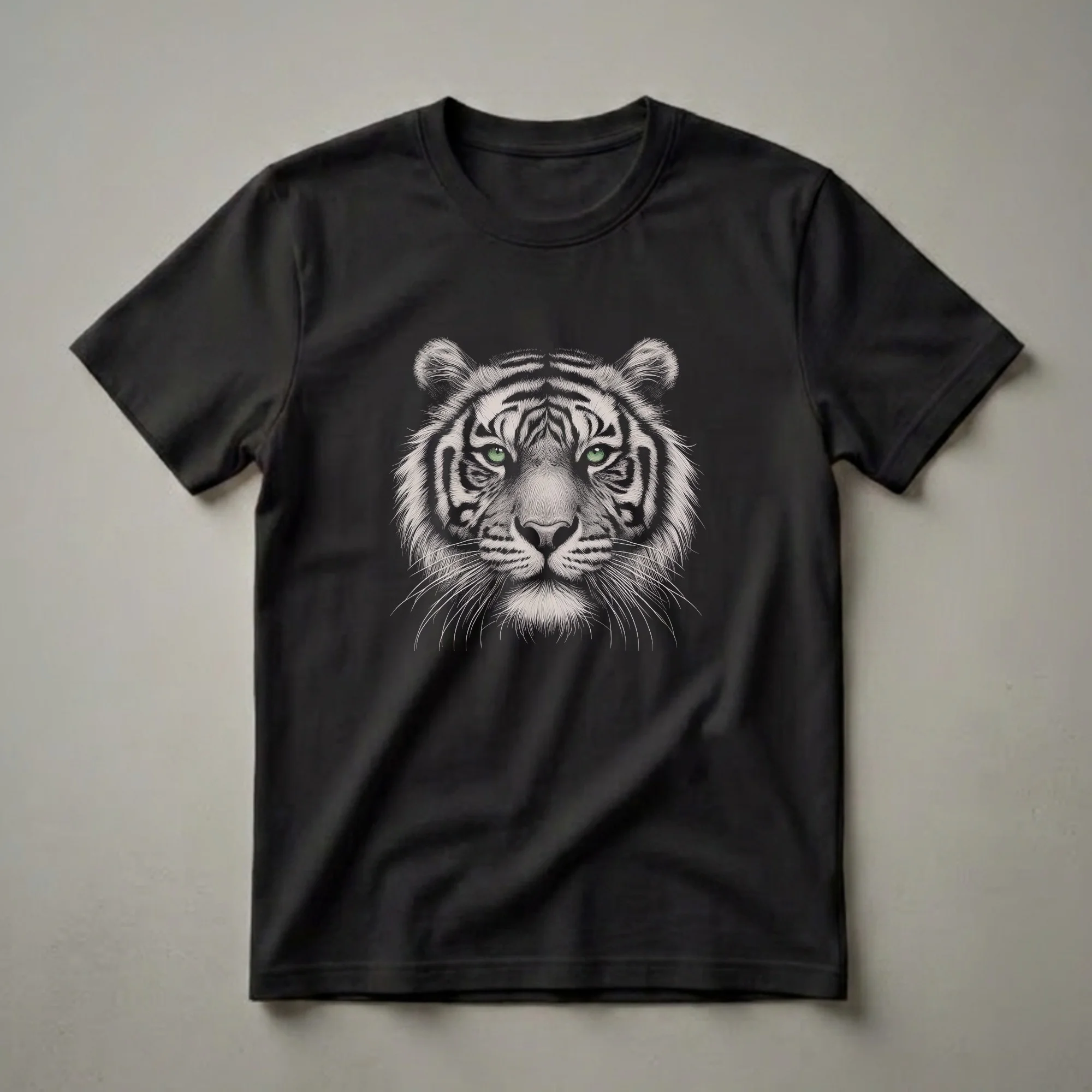 Wildlife enthusiasts and admirers of big cats will appreciate the intricate detail in this striking tiger face graphic tee. The artwork features a close-up of a tiger's face, rendered in a classic black and white drawing style, emphasizing the texture of its fur and the intensity of its piercing green eyes. Tigers, the largest of all big cat species, are apex predators native to Asia, known for their distinctive stripes and powerful presence. This shirt captures the raw beauty and untamed spirit of these magnificent animals. It's a thoughtful gift for anyone who is drawn to the wild, whether they are hikers, nature photographers, or simply appreciate the artistry of wildlife illustration. This tee works well for casual outings, nature walks, or as a conversation starter among fellow animal lovers. Wear it to express your admiration for these incredible creatures and their vital role in their ecosystems. The detailed linework and bold imagery make this t-shirt a standout piece for any wardrobe, celebrating the enduring allure of the tiger.