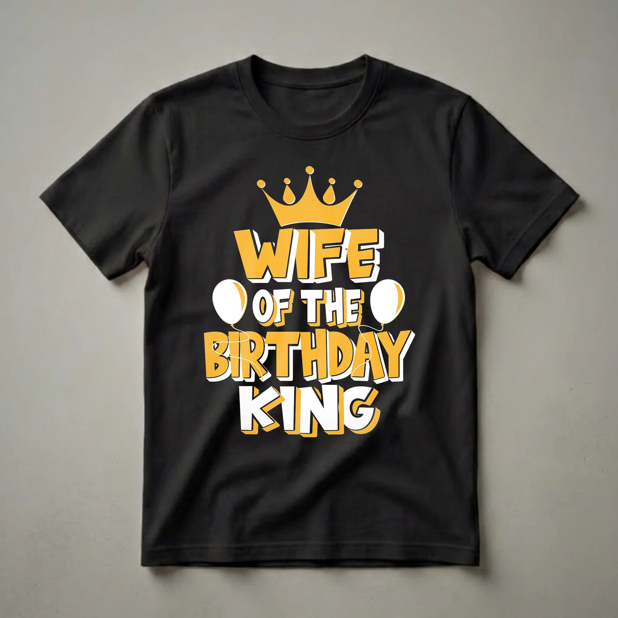 The wife of the Birthday King is ready to celebrate in style with this eye-catching graphic tee. The design features a bold, yellow and white 3D-style text that reads 'WIFE OF THE BIRTHDAY KING', topped with a regal yellow crown and flanked by two white balloons with yellow accents. This t-shirt is a fantastic way for the queen to show her support and join in the birthday festivities. It's a staple in the collection for any wife whose husband is being celebrated. This shirt works well for milestone birthdays, whether it's a 30th, 40th, 50th, or any significant year marking a king's reign. Imagine the fun at a birthday dinner or party when the whole family is coordinating their celebratory apparel. This tee makes a thoughtful gift for the wife who wants to feel special on her husband's big day. She will reach for this shirt year after year to commemorate the occasion and her role as the queen beside the king.