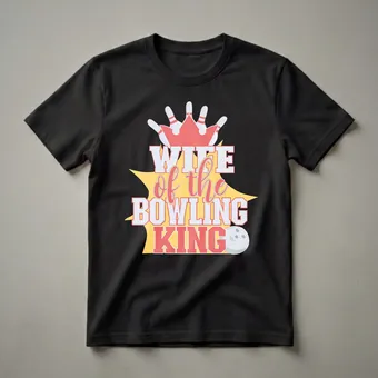 For the woman who stands proudly beside her champion bowler, this graphic tee declares her status as the 'Wife of the Bowling King.' The design features bold, stylized text that reads 'WIFE of the BOWLING KING,' set against a dynamic yellow burst. Atop the text, a crown is formed by three white bowling pins with red stripes, symbolizing royalty in the sport. To the right, a classic white bowling ball with three finger holes completes the theme. Bowling is a sport that requires precision, focus, and a bit of flair, with players aiming to knock down ten pins with a single ball. This shirt is a thoughtful gift for the wife of a dedicated bowler, whether they compete in leagues or enjoy casual games. It’s a great way for her to show support and pride for her partner's passion. This comfortable tee is suitable for wearing to the bowling alley to cheer on her king, or for casual outings where she wants to display her connection to the sport. It makes a thoughtful gift for birthdays, anniversaries, or just because.