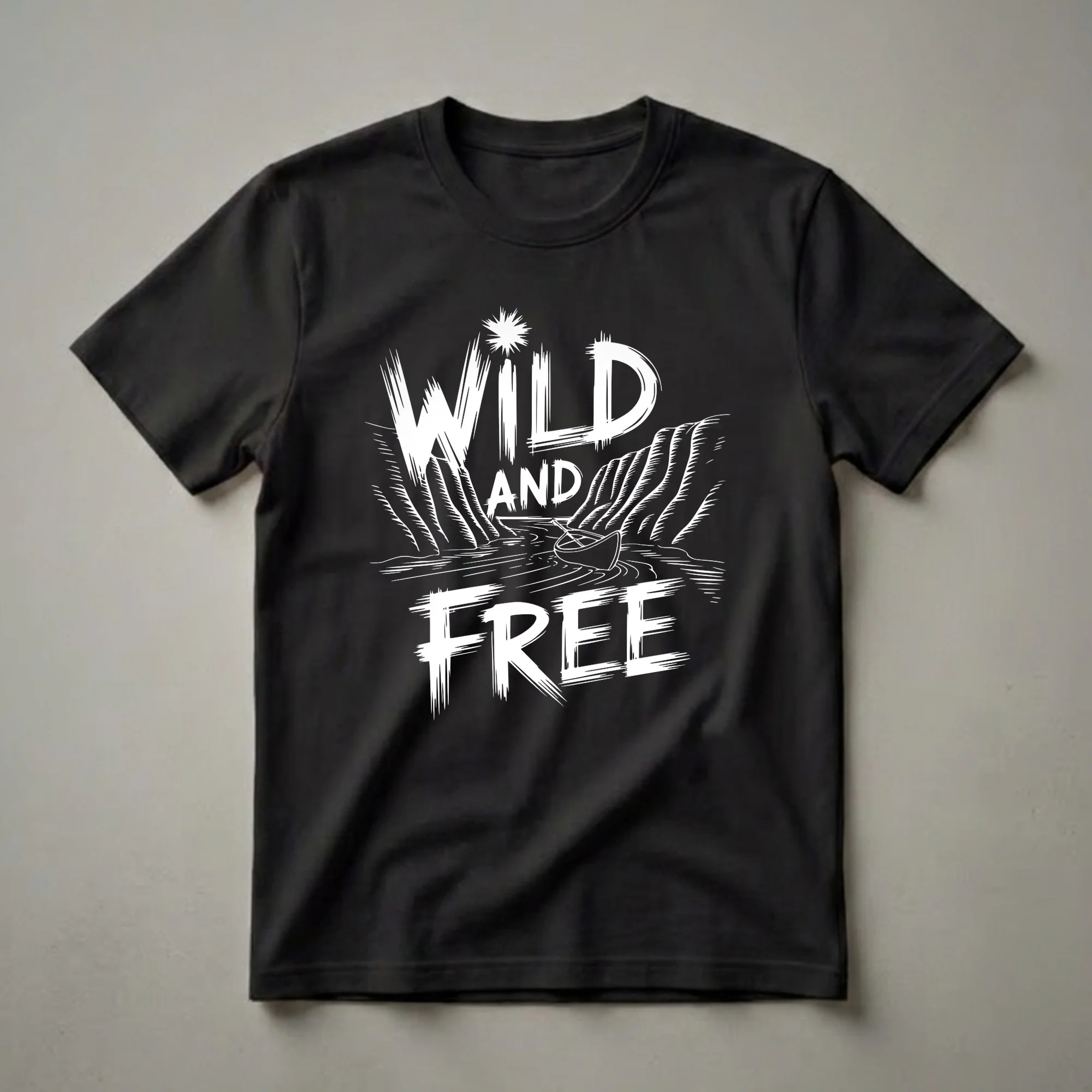 Outdoor adventurers who seek tranquility and freedom will reach for this striking graphic tee. The design features bold, brush-stroke style lettering that spells out "WILD AND FREE." Nestled within the landscape depicted are rugged mountains rendered in a detailed, hatched line art style, suggesting a remote canyon or wilderness area. A small canoe, complete with a paddle, floats serenely on the rippling water, symbolizing exploration and escape. Above the mountains, a stylized sun or starburst radiates light, adding to the sense of natural wonder. This t-shirt is a thoughtful gift for anyone who finds solace and exhilaration in nature, whether they are seasoned campers, avid hikers, or simply dream of their next wilderness escape. It's a staple for anyone who loves to paddle through calm waters or explore new trails. Wear this shirt on your next camping trip, kayaking adventure, or simply when you want to carry the spirit of the wild with you.