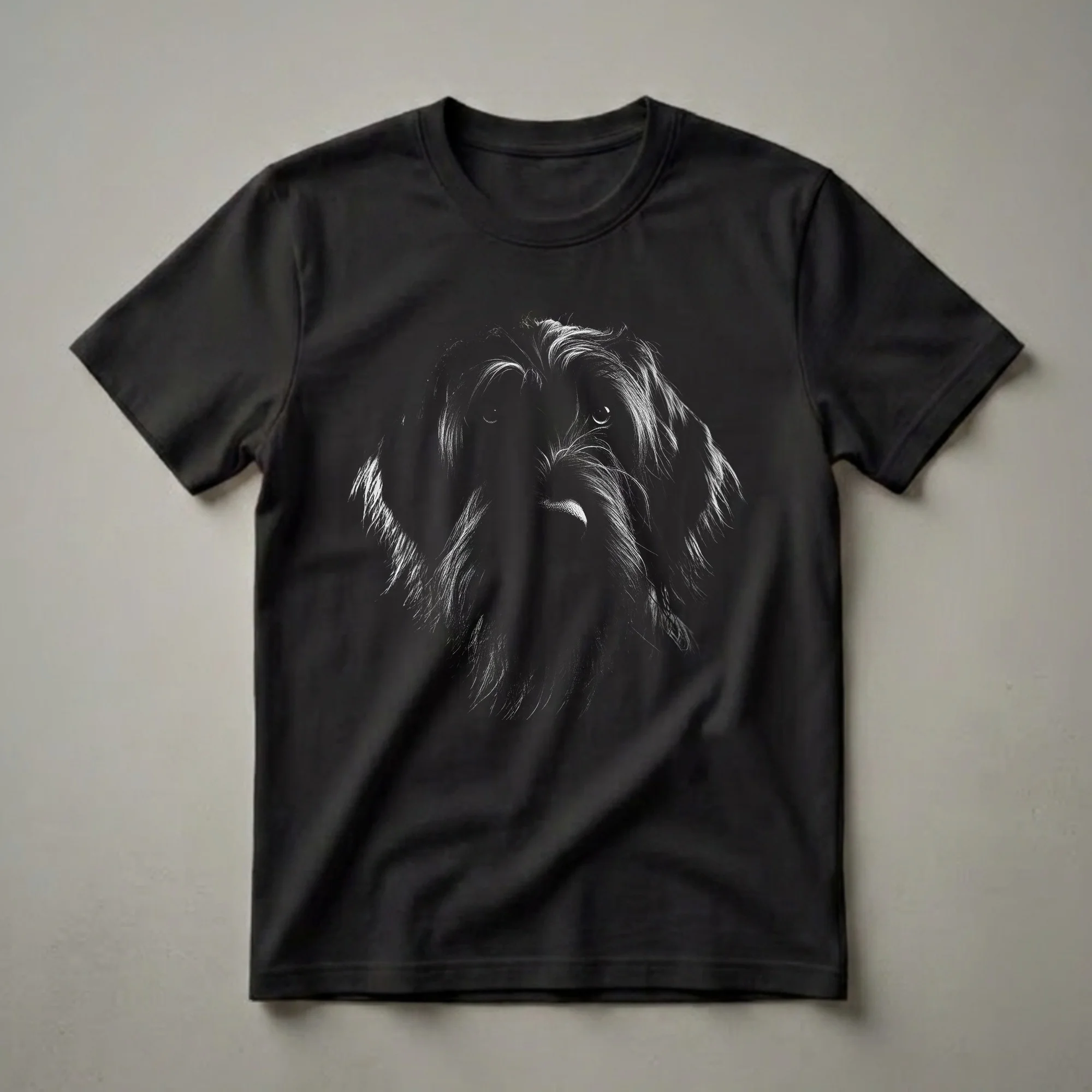 Wirehaired Pointing Griffon owners know the breed's unique charm and intelligence. This striking graphic tee features a dramatic black and white art design of the dog's face, with textured fur and soulful eyes peeking out from the darkness. The Wirehaired Pointing Griffon, originating from France and the Netherlands, is known for its distinctive wiry coat and its versatility as a hunting dog, particularly for pointing game birds. This shirt is a thoughtful gift for any dog mom or dad who cherishes their Wirehaired Pointing Griffon. It's a go-to tee for casual outings, dog park visits, or simply relaxing at home with your canine companion. The artistic rendering captures the breed's characteristic facial features, making it an eye-catching piece for any dog enthusiast. Wear this t-shirt to express your deep connection with this intelligent and loyal breed, celebrating the unique bond you share. It's more than just apparel; it's a statement of your passion for your furry friend. This shirt is a staple for anyone who appreciates the distinctive look and spirited nature of the Wirehaired Pointing Griffon.