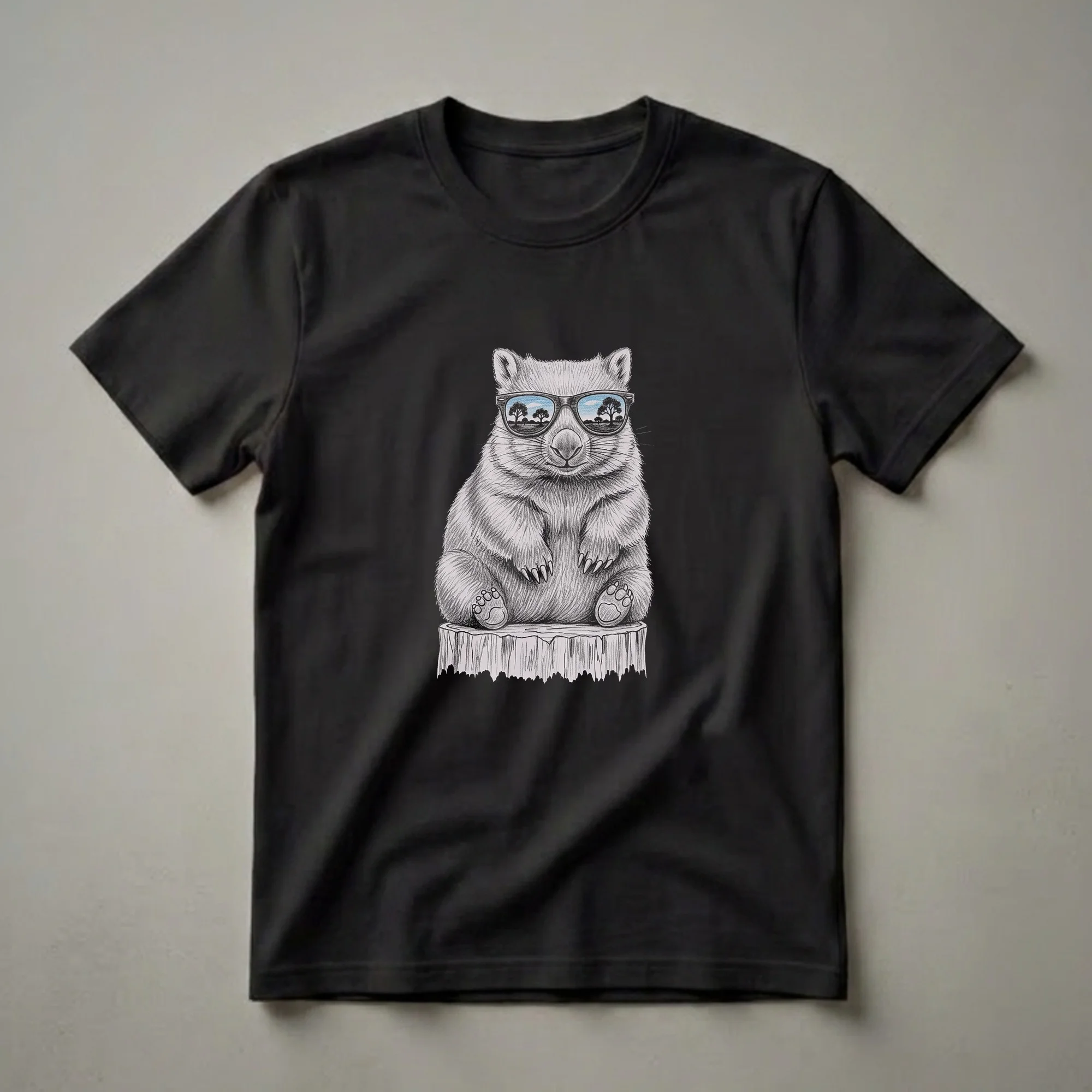 Wombat lovers will reach for this eye-catching graphic tee, featuring a charming pencil-style drawing of a wombat sporting cool sunglasses. The sunglasses reflect a serene landscape with trees under a blue sky, adding a touch of artistic flair. This wombat shirt is worn by those who appreciate the unique charm of these Australian marsupials. Wombats are known for their sturdy build and burrowing habits, native to Australia where they inhabit forests, woodlands, and heathlands. This t-shirt makes a thoughtful gift for any wildlife enthusiast or anyone who loves unique animal art. It's a great conversation starter and a comfortable addition to any casual wardrobe, great to wear to a nature walk or a relaxed gathering. Embrace your wild side with this distinctive wombat apparel.