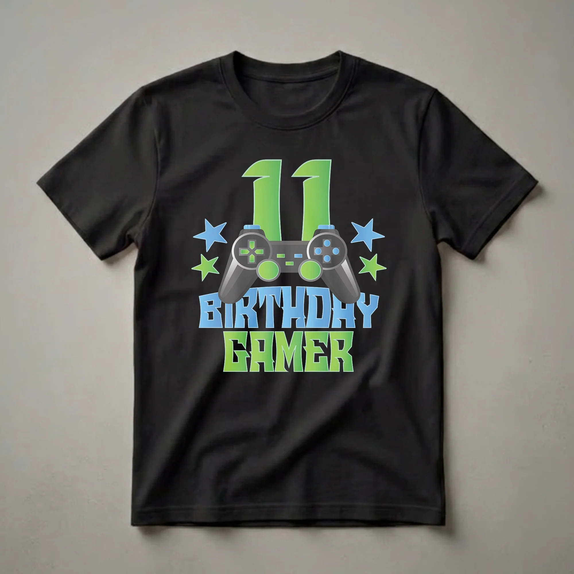 Eleven is a significant milestone, marking entry into the double digits and a prime age for diving deep into the world of video games. This graphic tee is for the 11-year-old birthday boy who lives and breathes gaming. The striking design prominently features the number '11' in vibrant green, symbolizing this special birthday. Central to the graphic is a detailed video game controller, rendered in shades of gray and blue, complete with buttons and joysticks, ready for action. Surrounding the controller are playful blue and green stars, adding a festive and energetic flair to the design. This shirt is more than just apparel; it's a declaration of passion for gaming. It's a thoughtful gift for any young gamer celebrating their eleventh birthday, whether they are into action-packed adventures, strategic challenges, or competitive online play. This t-shirt works well for birthday parties, casual wear, or even for a gaming tournament. It's a staple for any young gamer's wardrobe, celebrating their love for video games on their special day. This tee is a fantastic way for an 11-year-old to show off their gamer identity.