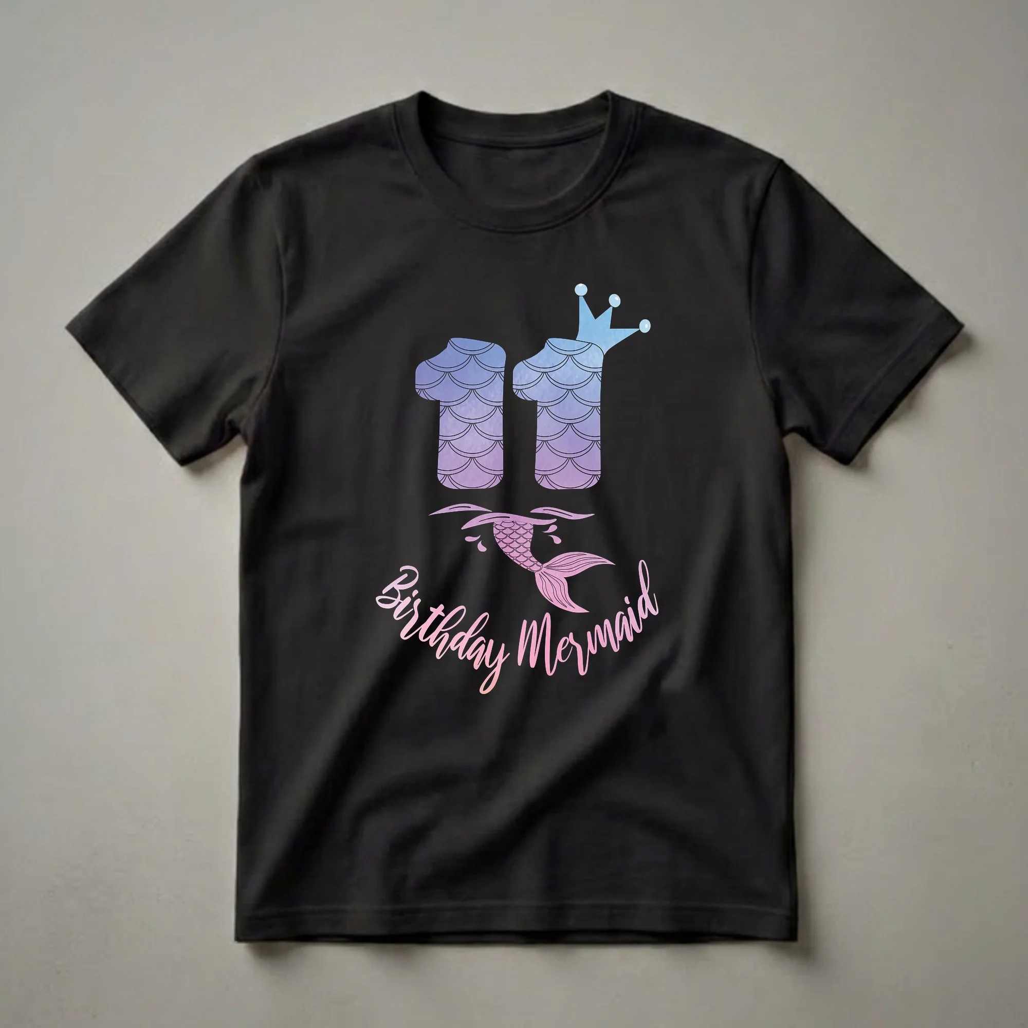 Eleven is a magical age, marking a significant step into the tween years, and this 'Birthday Mermaid' tee is designed to celebrate that milestone. The graphic features a prominent number '11' rendered in a beautiful watercolor style, transitioning from deep blues to soft purples, evoking the mystery of the ocean depths. Topping the number is a delicate crown, symbolizing the birthday girl's royal status on her special day. Below the number, a playful mermaid tail, shaded in soft pinks and purples, emerges from stylized waves, complete with splashing water droplets. The phrase 'Birthday Mermaid' is elegantly scripted in a gradient of pink and orange hues, curving around the mermaid tail. This t-shirt is a thoughtful gift for any girl turning eleven who dreams of mermaids and the sea. It's a fantastic choice for her birthday party, a casual day out with friends, or simply to wear as she embraces her new age. This shirt is a go-to tee for any young mermaid enthusiast ready to make a splash on her eleventh birthday.