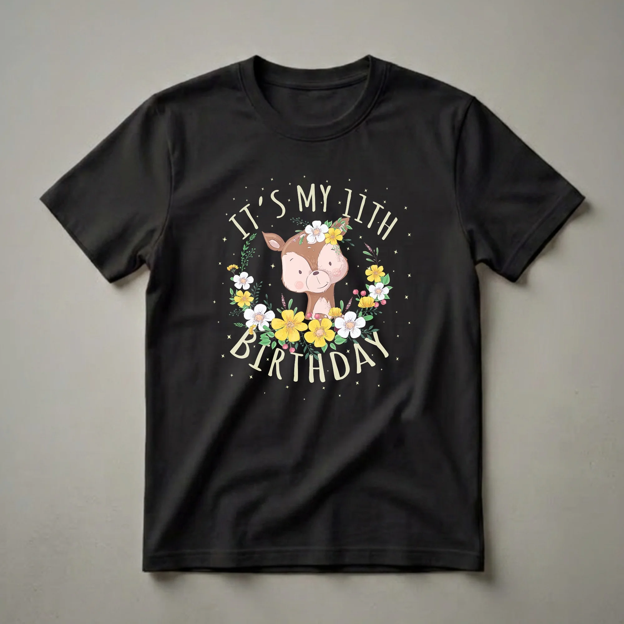 Eleven is a significant milestone, marking a transition into the pre-teen years, and this charming graphic tee is ready to celebrate. The design features a sweet, cartoon deer with rosy cheeks, adorned with a crown of delicate white and yellow flowers and green foliage. The text "IT'S MY 11TH BIRTHDAY" is presented in a playful, light-colored font, encircling the deer and floral arrangement. Scattered stars add a touch of magic to the black background, making this shirt truly eye-catching. This t-shirt is a thoughtful gift for any girl turning eleven who loves woodland creatures and a touch of princess flair. It's the perfect apparel for birthday parties, family gatherings, or just everyday wear to show off her special day. Deer, known for their gentle nature and grace, are often associated with the beauty of forests and meadows, adding a natural, whimsical element to the design. This shirt is a wonderful way for an 11-year-old girl to feel celebrated and special on her birthday, making it a go-to tee for the occasion.