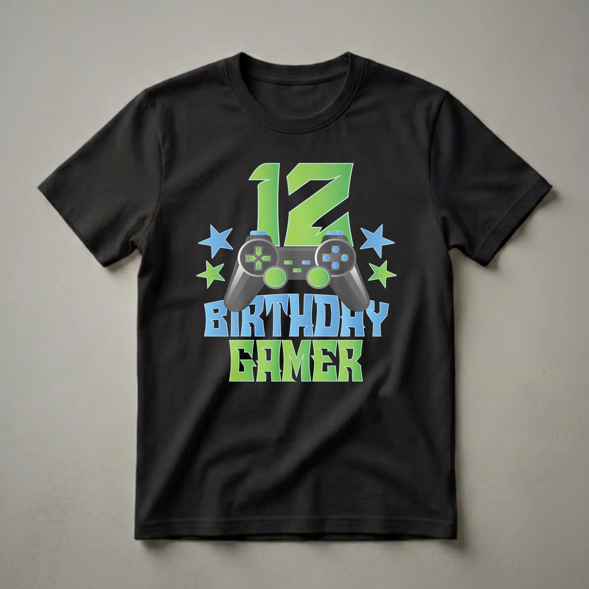 Twelve is a significant milestone, marking the transition into the pre-teen years and a time when gaming often becomes a central hobby. This graphic tee is for the 12-year-old birthday boy who lives and breathes video games. The striking design prominently features the number '12' in a vibrant green gradient, symbolizing this special age. Below it, a realistic-looking video game controller takes center stage, complete with buttons and joysticks, representing the passion for interactive entertainment. Surrounding the controller are scattered blue and green stars, adding a festive and energetic flair to the overall look. The words 'BIRTHDAY' in blue and 'GAMER' in green complete the celebratory message. This shirt is a thoughtful gift for any young gamer turning twelve, making their birthday celebration even more memorable. It's a go-to tee for birthday parties, casual hangouts, or simply leveling up in their favorite virtual worlds. The bold graphics and clear theme make it instantly recognizable to fellow gamers and friends. This t-shirt is a fantastic way for a 12-year-old to showcase their excitement for their birthday and their love for gaming.