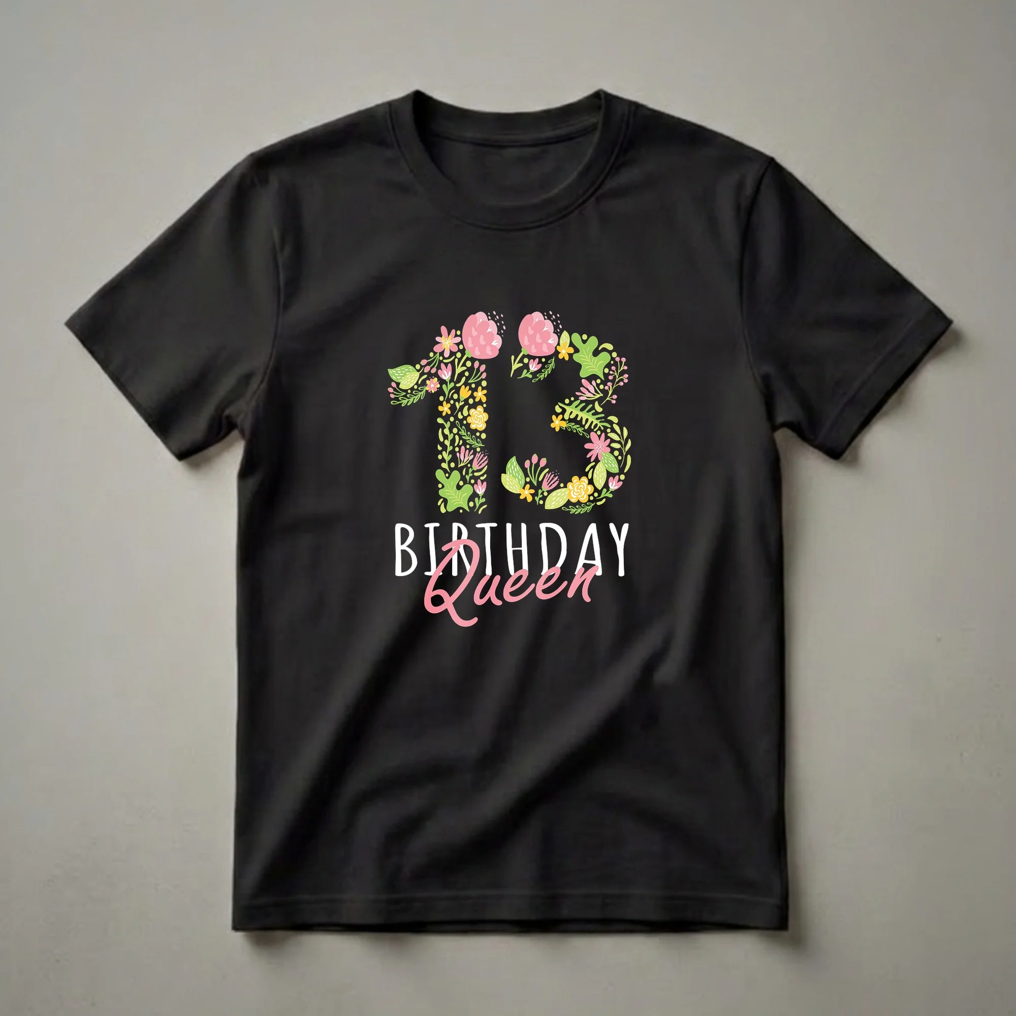 Celebrate your daughter's thirteenth birthday in regal style with this queenly floral graphic t-shirt featuring a vibrant number thirteen design.This 'Birthday Queen' graphic tee captures that celebratory spirit with a vibrant floral design. The number 13 is artfully crafted from an array of colorful flowers, leaves, and berries in shades of pink, yellow, and green, set against a classic black background. Below the floral number, the words "BIRTHDAY Queen" are displayed, with "BIRTHDAY" in bold white lettering and "Queen" in a playful, flowing pink script. This t-shirt is a thoughtful gift for any girl entering her teenage years, celebrating her special day with a touch of floral flair. It's a go-to tee for birthday parties, family gatherings, or casual wear as she embraces this exciting new chapter. The design is eye-catching and feminine, making it a cherished piece of apparel for any 13-year-old celebrating her transition into adolescence. This shirt is a wonderful way for her to feel like royalty on her big day.