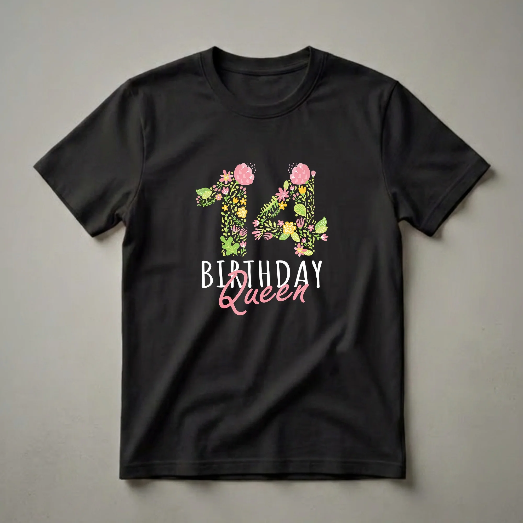 Turning 14 marks a significant milestone, transitioning from childhood to the teenage years, and this 'Birthday Queen' tee is a vibrant way to celebrate. The design prominently features the number '14', intricately formed by a colorful array of blooming flowers, lush green leaves, and delicate floral accents. Shades of pink, yellow, and green create a lively, garden-inspired aesthetic. Below the floral '14', the words 'BIRTHDAY Queen' are displayed, with 'BIRTHDAY' in bold white lettering and 'Queen' elegantly scripted in a soft pink. This eye-catching graphic t-shirt is a thoughtful gift for any girl turning fourteen who wants to feel special and celebrated on her big day. It's a staple in any birthday outfit, great to wear to a birthday party, family brunch, or any celebration marking this exciting age. This shirt is a fun way for a 14-year-old girl to express her birthday joy and embrace her reign as the 'Queen' of her special day.