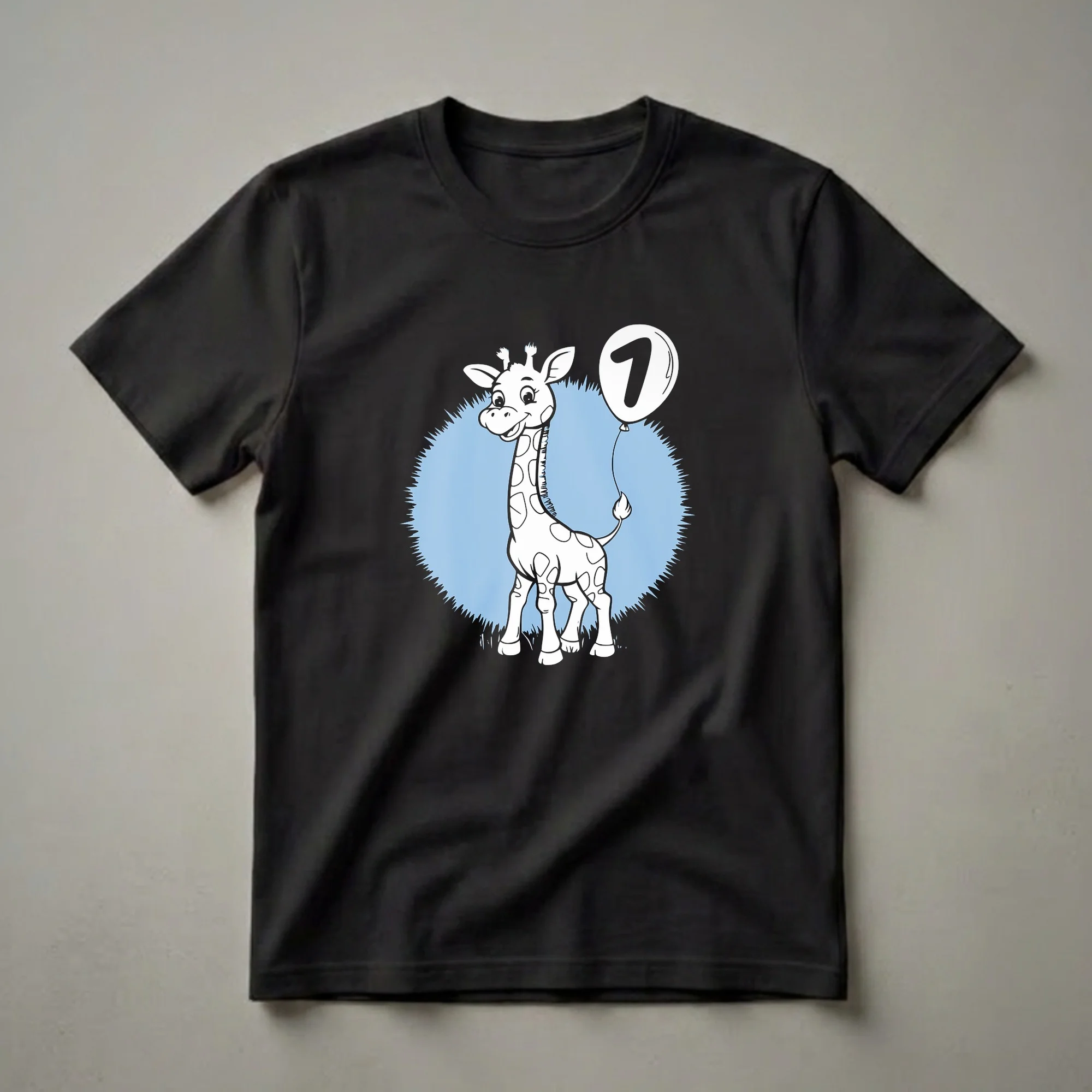 Turning one is a monumental milestone, and this graphic tee captures the joy of a first birthday celebration. The design features a friendly, cartoon giraffe with its signature spots, standing tall and holding a balloon emblazoned with the number '1'. This eye-catching graphic is set against a soft blue, fuzzy background, creating a playful and festive scene. Giraffes, known for their gentle nature and towering height, are a beloved animal for young children. This shirt is a thoughtful gift for any boy celebrating his first birthday, making his special day even more memorable. It's a delightful piece of apparel that parents will love seeing their little one wear to birthday parties or for everyday fun. This t-shirt is a wonderful way to commemorate a child's first year of life.