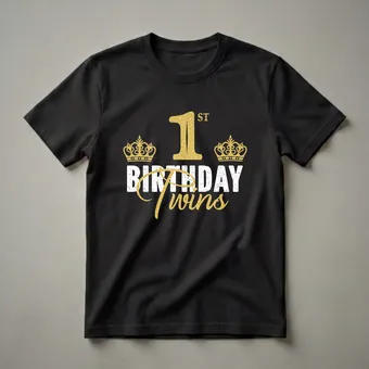 Twins sharing a first birthday is double the reason to celebrate, and this tee captures that dual milestone with regal style. The design centers on a large gold glitter number '1' with a superscript 'ST' above it, rendered in a sparkling shimmer pattern. Flanking the number on each side is an ornate gold glitter crown, two crowns, one for each twin, their detailed filigree work giving them a genuinely royal feel. Between and below the crowns, 'BIRTHDAY' appears in distressed white block lettering, and below that, 'Twins' flows in a large, graceful gold glitter script that matches the shimmer of the crowns and number. A baby's first birthday marks the completion of twelve months of rapid development, from newborn to walking, babbling, and engaging with the world. For twins, this milestone is shared by two children who have grown up side by side from the very first day, making the occasion uniquely meaningful for the whole family. This tee makes a thoughtful gift for the parents of one-year-old twins from grandparents, aunts, uncles, or family friends. Because the design uses crowns rather than explicitly gendered colors, it suits a boy-and-girl twin pair or twins of any gender combination. The twins can each wear one for their first birthday party, making for memorable coordinated photos. A keepsake-worthy shirt for a keepsake-worthy day.