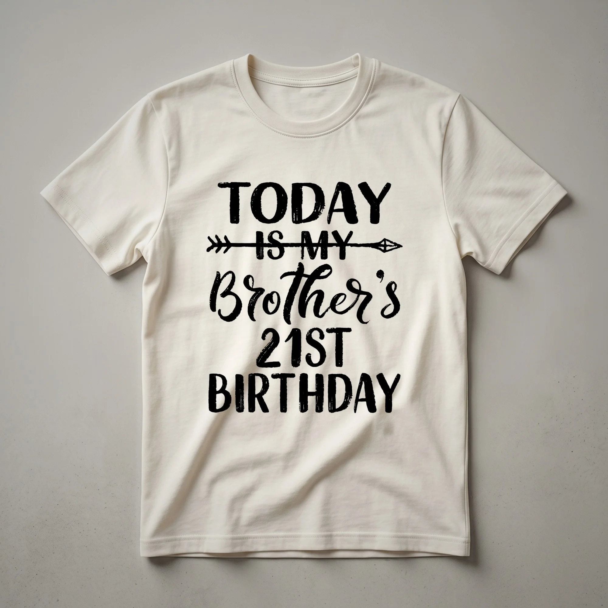 Brothers turning 21 deserve a special celebration, and this graphic t-shirt is a fantastic way to mark the milestone. The design features bold white lettering on a black shirt, clearly stating 'Today Is My Brother's 21st Birthday.' This tee is a thoughtful gift for any brother reaching this significant age, signifying his entry into legal adulthood. It's a fun piece of apparel that he can wear to his birthday party, a celebratory dinner, or any gathering with friends and family. The straightforward design ensures the message is clear and festive. This shirt serves as a great conversation starter and a lasting memento of his 21st birthday. It's a staple in any birthday wardrobe for the young man celebrating this important transition. Make his 21st birthday unforgettable with this eye-catching t-shirt.