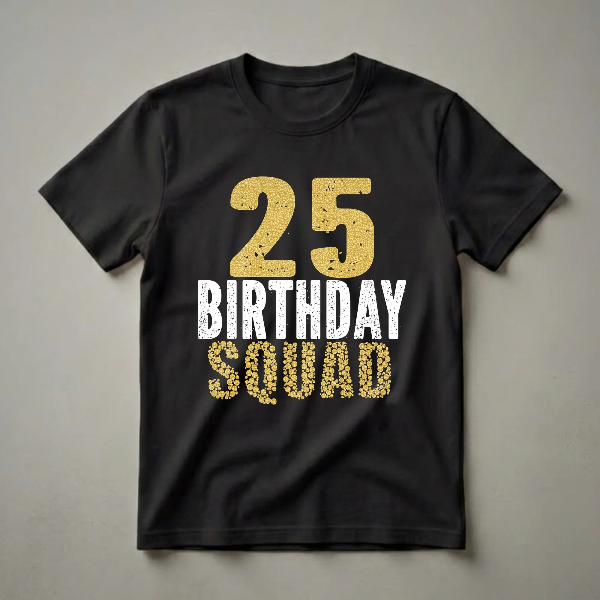 - "25th Birthday Squad" graphic t-shirt for women and men.