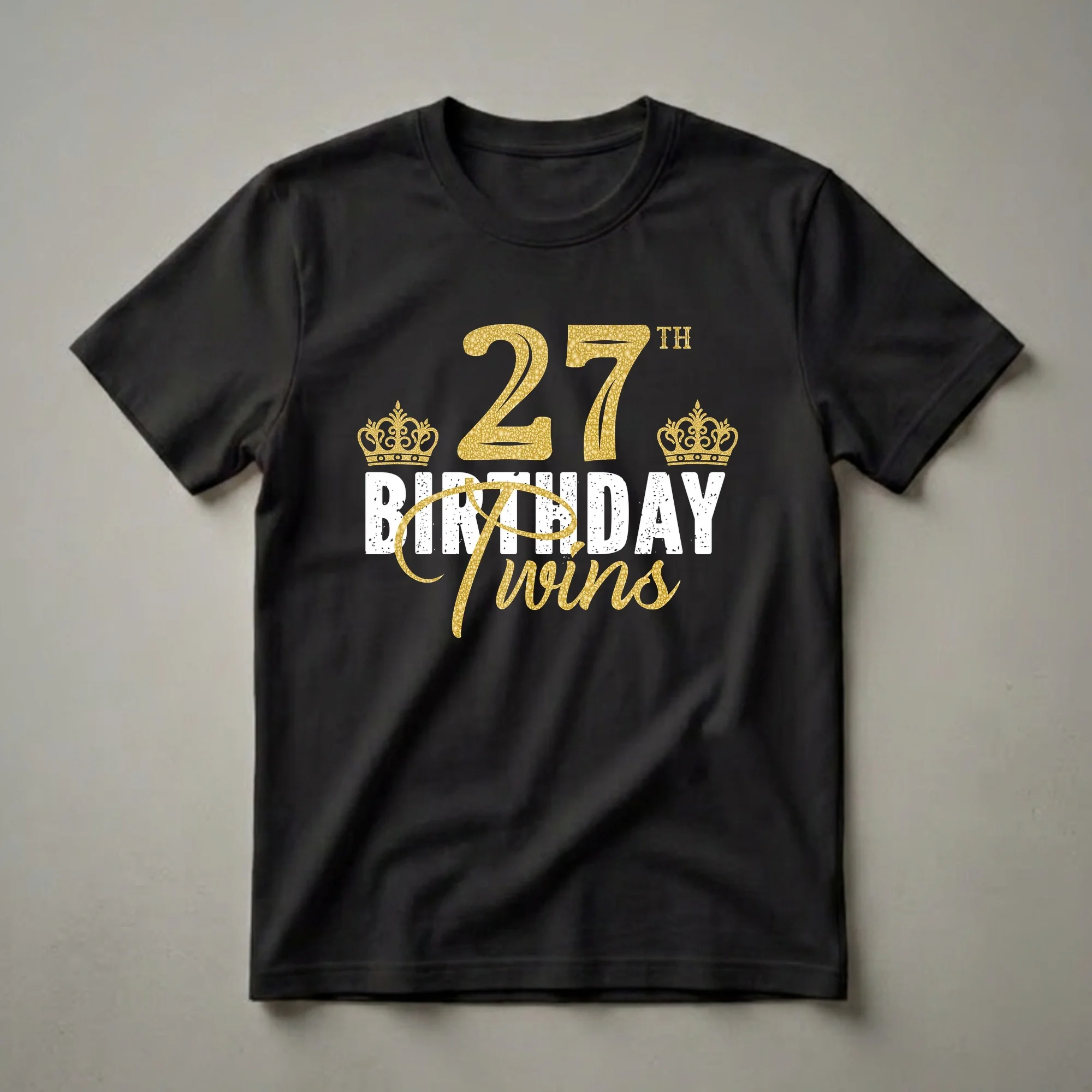 Twin siblings celebrating their 27th birthday will love this eye-catching graphic tee. The design features the number '27' in a shimmering gold glitter texture, accompanied by the words 'BIRTHDAY TWINS' in bold white distressed lettering. Two ornate gold crowns adorn the top corners, adding a regal touch to the celebratory theme. Turning 27 marks a significant milestone, moving further into the prime of adulthood, and this shirt is a fun way for twin brothers and sisters to commemorate the occasion together. It's a thoughtful gift idea for any pair of twins hitting this age, whether for a birthday party, a family gathering, or just as a special surprise. This t-shirt is a fantastic way for them to showcase their unique bond and shared birthday. Wear it to birthday dinners, brunches, or any celebration marking this special year. This shirt is a staple for any twin sibling duo celebrating their 27th year.