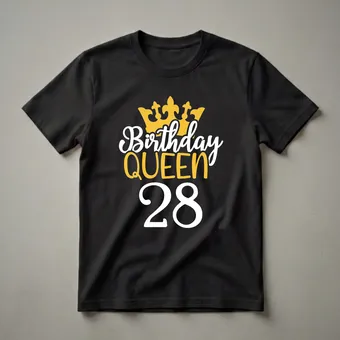 Turning 28 is a significant milestone, marking a transition into a new phase of adulthood. This 'Birthday Queen' graphic tee is designed to celebrate this special occasion with flair. The design prominently features a regal golden crown atop bold, stylized lettering that proclaims 'Birthday QUEEN' in white and gold. Below this, the number '28' is displayed in large white numerals, clearly indicating the age being celebrated. This shirt is a fantastic way for any girl to express her excitement and feel like royalty on her 28th birthday. It's a staple piece for birthday celebrations, whether it's a casual get-together with friends or a more formal family gathering. This tee makes a thoughtful gift for a daughter, sister, or friend who is about to celebrate her 28th birthday, offering a fun and memorable way to commemorate the day. She will reach for this shirt to wear to her birthday brunch or party, making her feel celebrated and special.