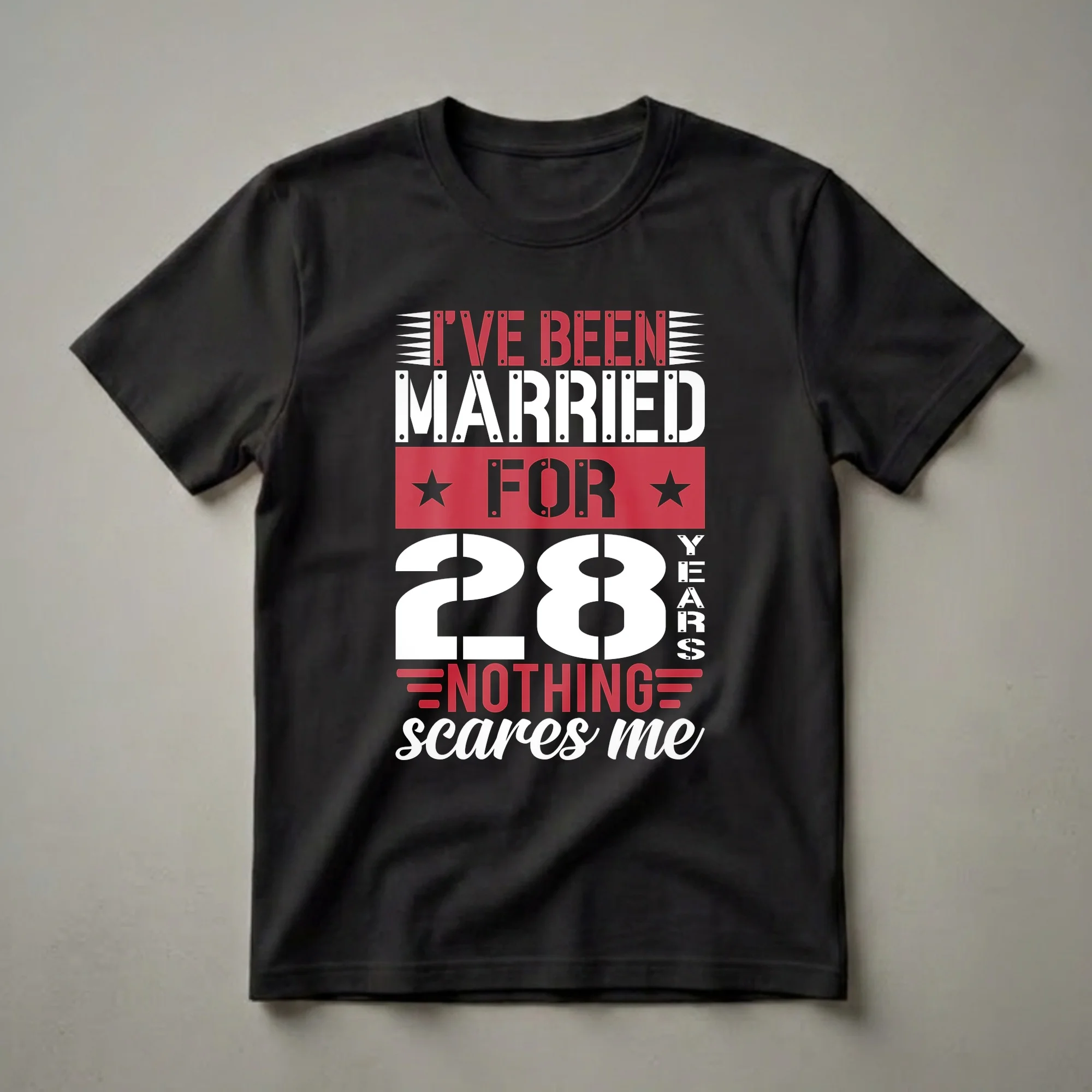Married couples who have reached the significant milestone of 28 years together will appreciate this bold graphic tee. The design features the statement 'I'VE BEEN MARRIED FOR 28 YEARS NOTHING scares me' in a striking, stencil-like font. The number '28' is prominently displayed in large white lettering, emphasizing the duration of the union. Red accents and black stars add a touch of flair to the design, making it a standout piece. This shirt is a testament to the enduring strength and humor found in a long-lasting marriage. The 28th wedding anniversary, often associated with the traditional gift of a silver watch, signifies a deep and lasting bond. This t-shirt makes a thoughtful gift for a spouse celebrating this special occasion, or for a couple looking to share their marital pride. It's a conversation starter and a declaration of a relationship that has weathered the years. Wear this shirt to anniversary dinners, parties, or casual gatherings to showcase your commitment and your shared sense of humor. It's a staple for any couple celebrating nearly three decades of married life.