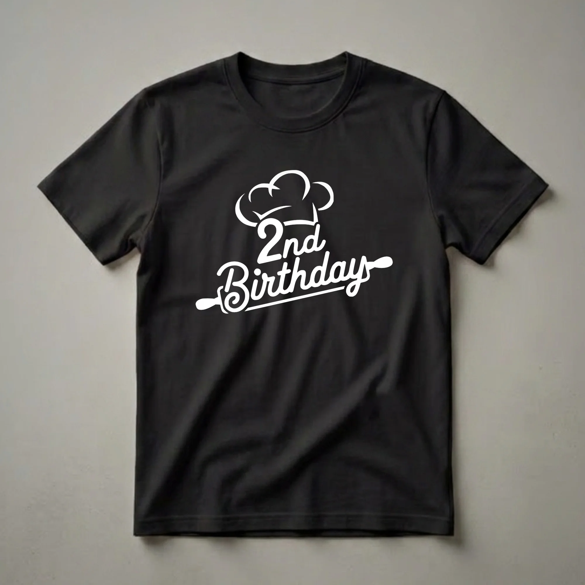 Two-year-olds are entering a phase of burgeoning independence and curiosity, making their second birthday a significant milestone. This chef-themed birthday tee is worn by the little one celebrating this special occasion. The graphic features a stylized chef's hat, symbolizing culinary aspirations, paired with a rolling pin, a classic baking tool. The words '2nd Birthday' are prominently displayed in a playful, script font, making it clear this shirt is for a very special two-year-old. This t-shirt is a thoughtful gift for any child who loves to play pretend in the kitchen or is fascinated by cooking. Imagine the birthday boy or girl wearing this shirt to their party, perhaps even while helping to bake their own cake. It’s a fun way to commemorate their second year and embrace their growing personality. This shirt is a wonderful keepsake for parents and a delightful outfit for the birthday child to wear on their big day, making them feel like a star chef.