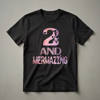 This eye-catching graphic tee is suited for a little girl celebrating her second birthday. The design features a large, stylized number '2' filled with a pink and purple watercolor texture, adorned with a silhouette of a mermaid. Below the number, the phrase "AND MERMAZING" is presented in bold, playful lettering, also with a watercolor fill and accented with smaller mermaid silhouettes, starfish, anchors, and crabs. The word 'AND' has a scale pattern fill, adding to the underwater theme. This shirt is a wonderful way to commemorate a special milestone. It's a thoughtful gift for any toddler who is fascinated by mermaids and the magical world beneath the waves. Imagine her excitement wearing this vibrant t-shirt to her birthday party, a trip to the aquarium, or just for everyday play. This tee is a staple for any young mermaid enthusiast's wardrobe, making her second birthday celebration extra special and memorable. It's a go-to tee for any occasion where she wants to show off her love for all things mermaids.
