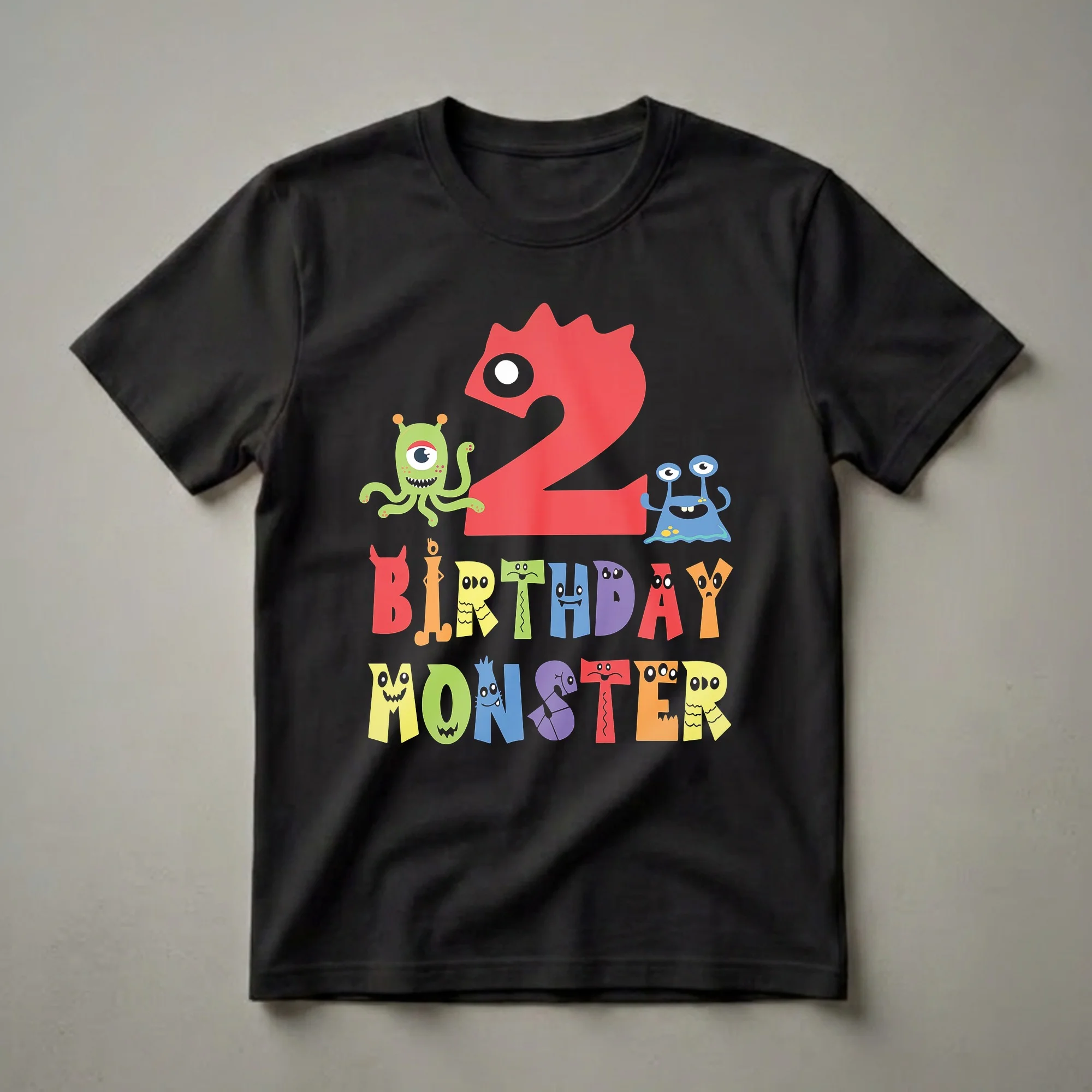 Two-year-olds are entering a world of imagination and play, and this "Birthday Monster" tee is the perfect way to celebrate their special day. The design showcases a large, vibrant red number '2' that serves as the centerpiece, playfully interacting with a cast of quirky, colorful monsters. To the left, a green, one-eyed alien with tentacles waves hello, while to the right, a blue, multi-eyed creature with a wide grin adds to the fun. Below the number, the words "BIRTHDAY MONSTER" are spelled out in a playful, block-letter font, with each letter transformed into a unique, friendly monster face. The letters themselves are a rainbow of colors, from red and orange to yellow, green, blue, and purple, making this shirt visually engaging for young children. This graphic tee is a thoughtful gift for any child turning two who loves monsters, aliens, or just fun, colorful designs. It's a shirt that works well for a birthday party, a playdate, or just for everyday fun, making their second birthday celebration even more memorable. This shirt is a fantastic way for parents or grandparents to mark this exciting milestone.