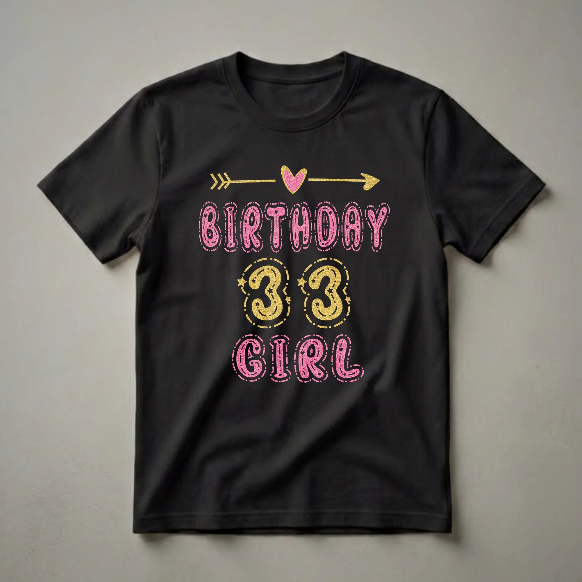 Turning 33 marks a significant milestone, and this 'Birthday Girl' tee is a vibrant way to celebrate. The design features the words "BIRTHDAY" and "GIRL" in a bubbly, pink font with a glitter effect, accented by small hearts and dots. Below, the number "33" is prominently displayed in a bold, gold glitter font, surrounded by stars and decorative swirls. This shirt is a fantastic choice for any woman hitting this age, whether it's for a birthday party, a casual get-together, or just to wear her birthday pride. It makes a thoughtful gift for a daughter, sister, or friend who is turning 33. Imagine her excitement unwrapping this fun and festive t-shirt, ready to make her birthday celebration sparkle. This graphic tee is a go-to for birthday brunches or evening festivities, ensuring she feels special on her big day. It's a wearable piece of birthday cheer that she'll reach for year after year when reminiscing about her 33rd.