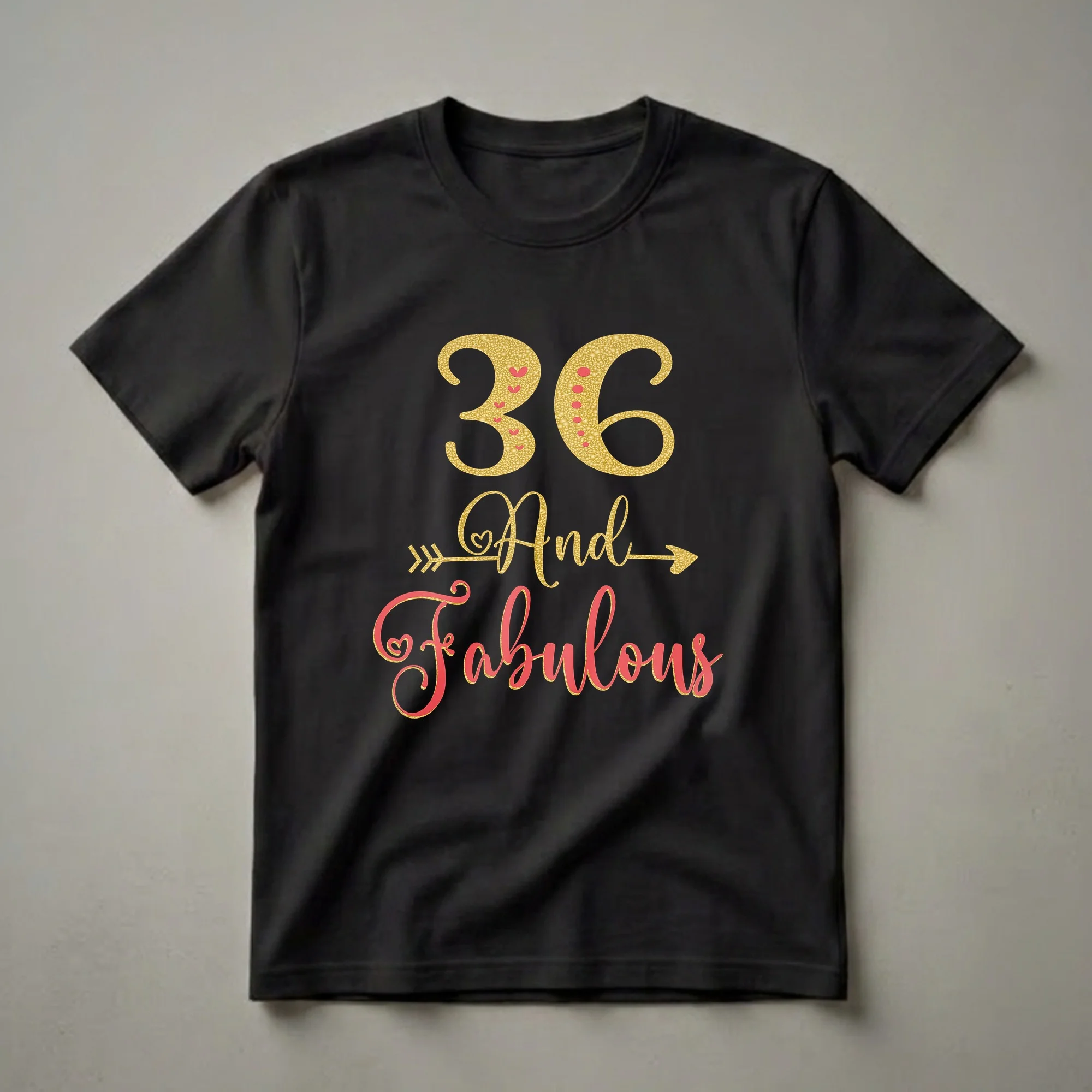 Women celebrating their 36th birthday will reach for this "36 And Fabulous" graphic tee. The design features the number 36 in a shimmering gold glitter texture, adorned with small red hearts and dots. Below it, the phrase "And Fabulous" is written in a stylish coral script, also with a gold glitter outline. An arrow graphic, composed of gold glitter, pierces through the word "And," adding a playful touch. This t-shirt is a vibrant way for any woman to express her confidence and style as she enters a new year. Turning 36 is a significant milestone, often marking a period of established career and personal growth, making this shirt a fitting tribute to that stage of life. It’s a thoughtful gift idea for a wife, sister, or best friend who embraces her age with flair. Wear this shirt to birthday parties, brunches, or casual outings to showcase your celebratory spirit. This eye-catching apparel is sure to be a conversation starter, celebrating the fabulousness of being 36.