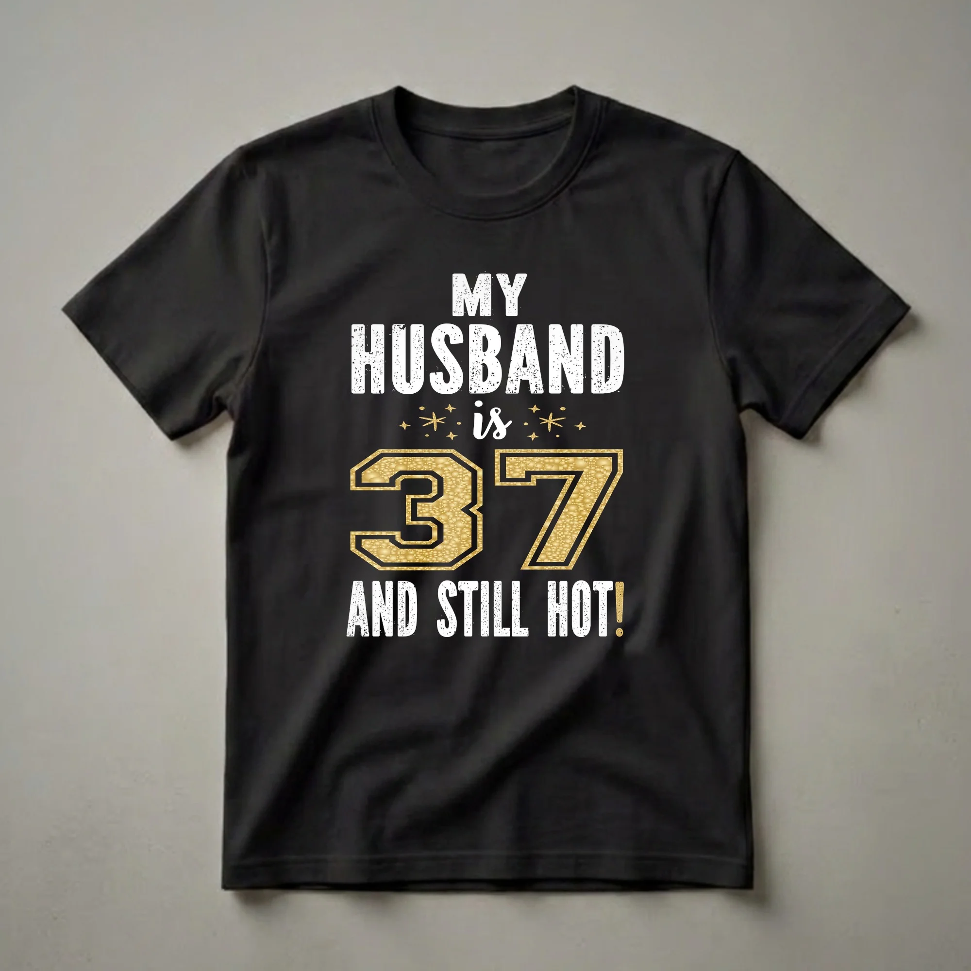 Turning 37 marks a significant milestone, a time when many men hit their stride, balancing experience with continued vitality. This graphic tee celebrates that very essence, proclaiming 'My Husband Is 37 And Still Hot!' in bold, distressed white lettering. The centerpiece is a large, eye-catching '37' rendered in a shimmering gold texture, evoking a sense of celebration and premium quality. Surrounding the number are subtle, sparkling accents, adding a touch of festivity to the design. This shirt is a fantastic way for a wife to show appreciation for her husband as he enters this prime year. It's a playful and affectionate statement piece that he will reach for, whether for a casual birthday gathering or just to wear around the house. This t-shirt makes a thoughtful gift for any wife looking to celebrate her husband's 37th birthday with humor and style. It’s a wearable declaration of enduring attraction and a reminder that age is just a number when you’re still looking this good. Imagine him wearing this to his birthday dinner or a casual get-together with friends, sparking smiles and compliments.