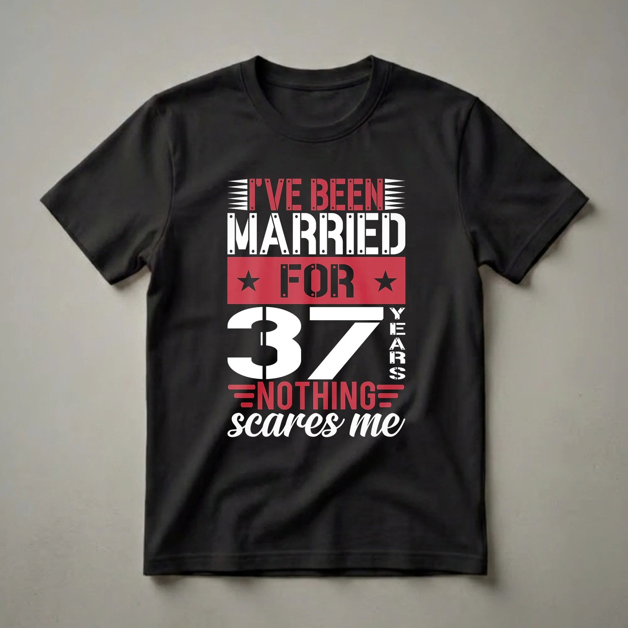 Thirty-seven years of marriage is a significant milestone, a testament to enduring love and partnership. This graphic tee proudly proclaims "I've Been Married For 37 Years. Nothing Scares Me," a humorous and confident statement for anyone who has navigated nearly four decades together. The design features bold, stencil-style lettering in striking red and white against a classic black background, making it an eye-catching piece. The prominent "37" is a clear declaration of this impressive marital achievement. This shirt is a thoughtful gift for a spouse celebrating their 37th anniversary, or for a couple looking to commemorate their long-lasting union. It’s a conversation starter, a thoughtful choice for anniversary parties, family gatherings, or casual wear that showcases pride in a lasting relationship. Wearing this t-shirt signifies a shared journey filled with experiences that have undoubtedly built resilience and a unique sense of humor. It’s a staple for any couple marking this special occasion, offering a blend of humor and heartfelt celebration.
