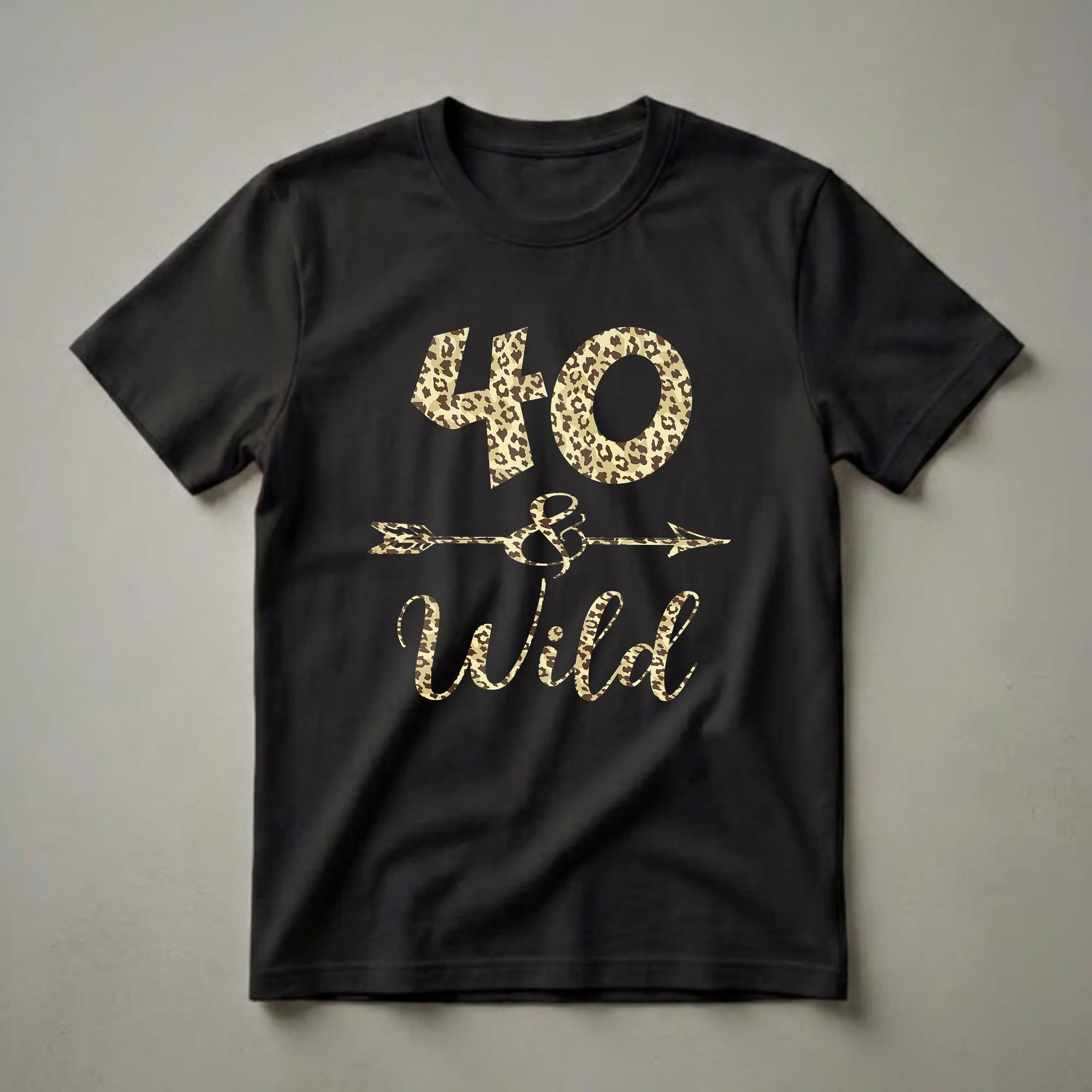 This striking graphic tee features the bold statement "40 & Wild" presented in a fashionable leopard print pattern. The numbers '40' are large and impactful, followed by a stylized ampersand with an arrow piercing through it, and then the word 'Wild' in a flowing script. The entire design is rendered in a classic leopard print with shades of tan, brown, and black, set against a solid background, likely black as seen in the mockup. This shirt is a statement piece for any woman celebrating her 40th birthday, exuding confidence and a sense of adventure. The leopard print motif adds a touch of fierce glamour, making this apparel suitable for birthday parties, casual outings, or as a fun way to mark the milestone. It's a thoughtful gift for a friend or family member who is turning 40 and wants to embrace the occasion with a playful and stylish attitude. This t-shirt makes a memorable present for the milestone birthday celebration, allowing the wearer to showcase their vibrant personality. Wear it to your birthday brunch or a night out with friends to show off your wild side.