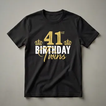 Forty-one years is a significant milestone, and this 'Birthday Twins' shirt is a fantastic way for twin siblings to celebrate together. The design features the number '41' in a shimmering gold glitter texture, accompanied by the word 'ST' also in gold. Flanking the number are two ornate gold crowns, symbolizing royalty and celebration. Below the prominent '41', the words 'BIRTHDAY TWINS' are displayed in a distressed white font, with the word 'Twins' written in a flowing, elegant gold script that overlays the distressed text. This graphic tee is a perfect way for a twin brother and sister to mark their shared 41st birthday. It's a thoughtful gift idea for the twins in your life who share a special bond. Imagine them wearing this matching shirt set to a birthday brunch or a family gathering, creating memorable moments. This t-shirt is a statement piece that highlights their unique connection and the joy of celebrating another year together. It's a staple for any twin sibling duo reaching this age.