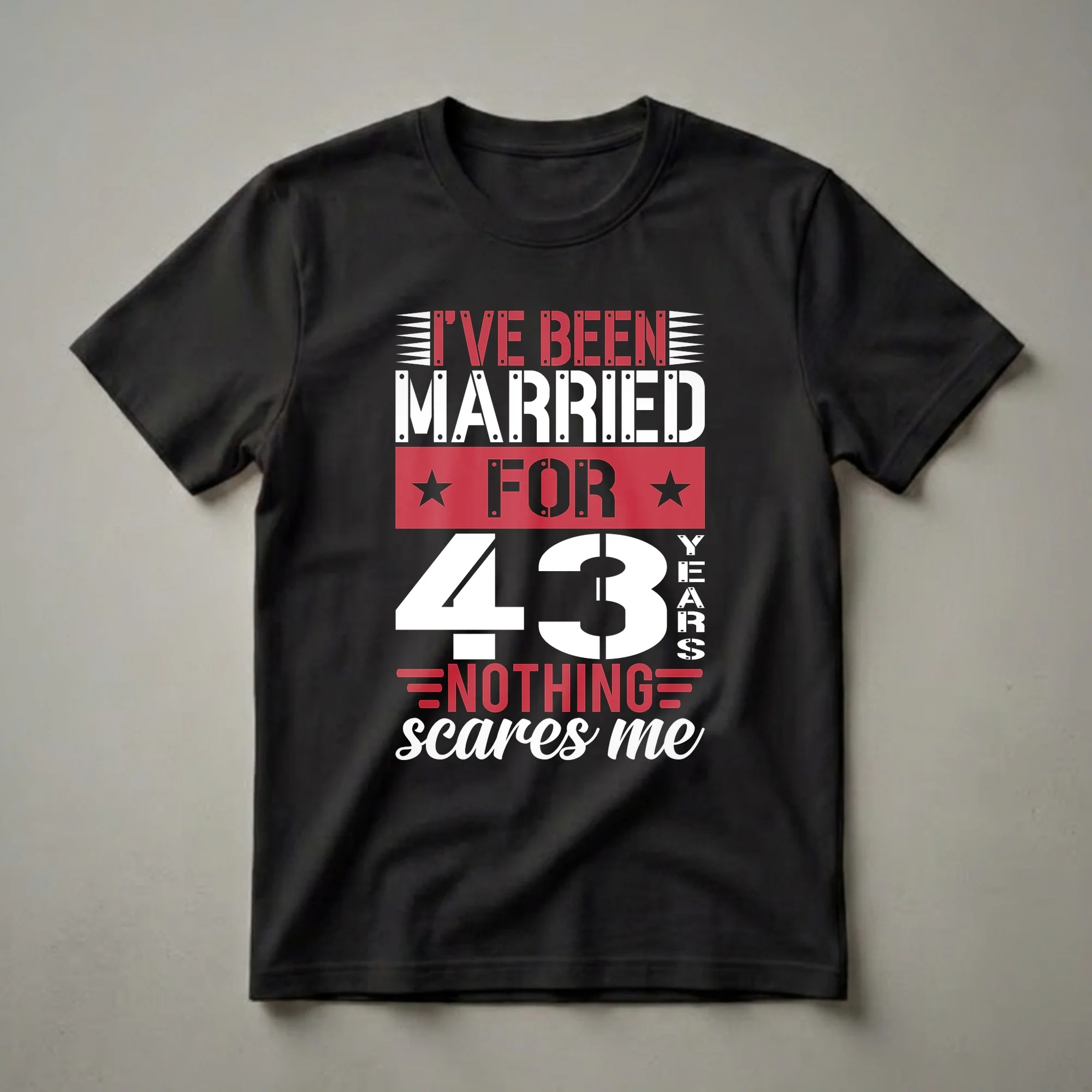 Forty-three years of marriage is a remarkable milestone, a testament to enduring love and shared experiences. This graphic tee proudly proclaims "I've Been Married For 43 Years. Nothing Scares Me." The design features bold, stencil-style lettering in white and red against a black background, emphasizing the strength and resilience built over nearly five decades together. The number 43 is prominently displayed, with the word "YEARS" stacked vertically beside it. Red accents, including stars and horizontal lines, add a touch of flair to the impactful typography. This shirt is a fantastic way for a husband or wife to commemorate their 43rd wedding anniversary, whether it's a gift from their spouse or a statement piece they wear to celebrate. It's a conversation starter, a badge of honor for navigating life's challenges side-by-side. This tee works well for the couple celebrating this significant anniversary, or for children looking for a unique gift for their parents. Imagine wearing this to an anniversary dinner or a family gathering, sharing a laugh about the journey. It's more than just apparel; it's a declaration of a long-lasting partnership.