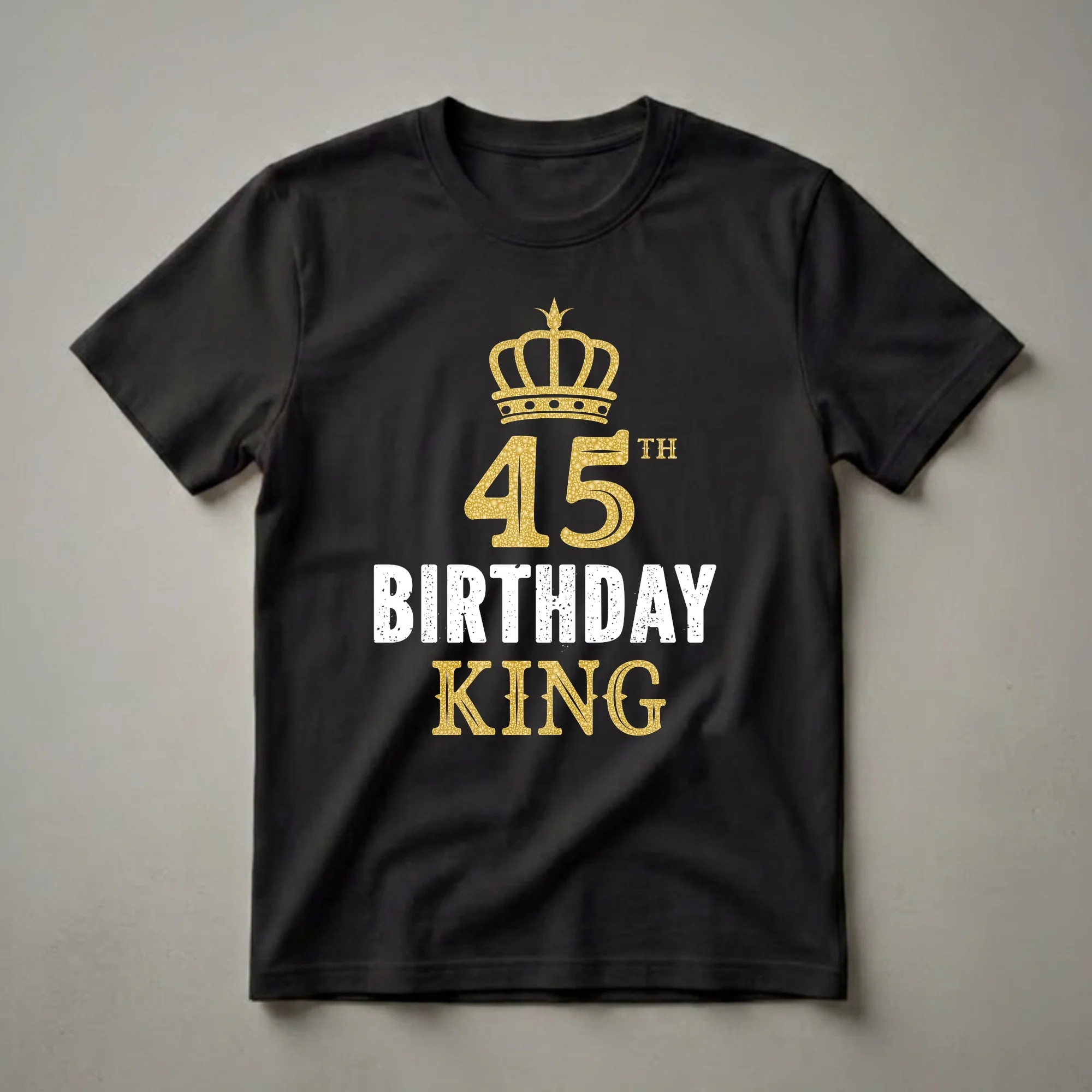 Men turning 45 deserve to be celebrated like royalty, and this '45th Birthday King' t-shirt makes that clear. The design prominently features a striking golden crown, symbolizing the milestone age and the recipient's status as the 'king' of his birthday celebration. Below the crown, the number '45' is rendered in a textured gold, with 'TH' positioned to its right, indicating the ordinal number. The words 'BIRTHDAY KING' are displayed in bold, distressed white lettering, creating a strong contrast against the black background of the shirt. This graphic tee is a fantastic way for the birthday man to showcase his pride on his special day. It's a thoughtful gift for any man hitting this significant age, whether it's for a birthday party, a casual get-together, or just to wear around town. This shirt is a staple for any wardrobe celebrating a 45th birthday, offering a fun and festive way to mark the occasion. Imagine him wearing this to his birthday dinner or brunch, receiving compliments and well wishes.