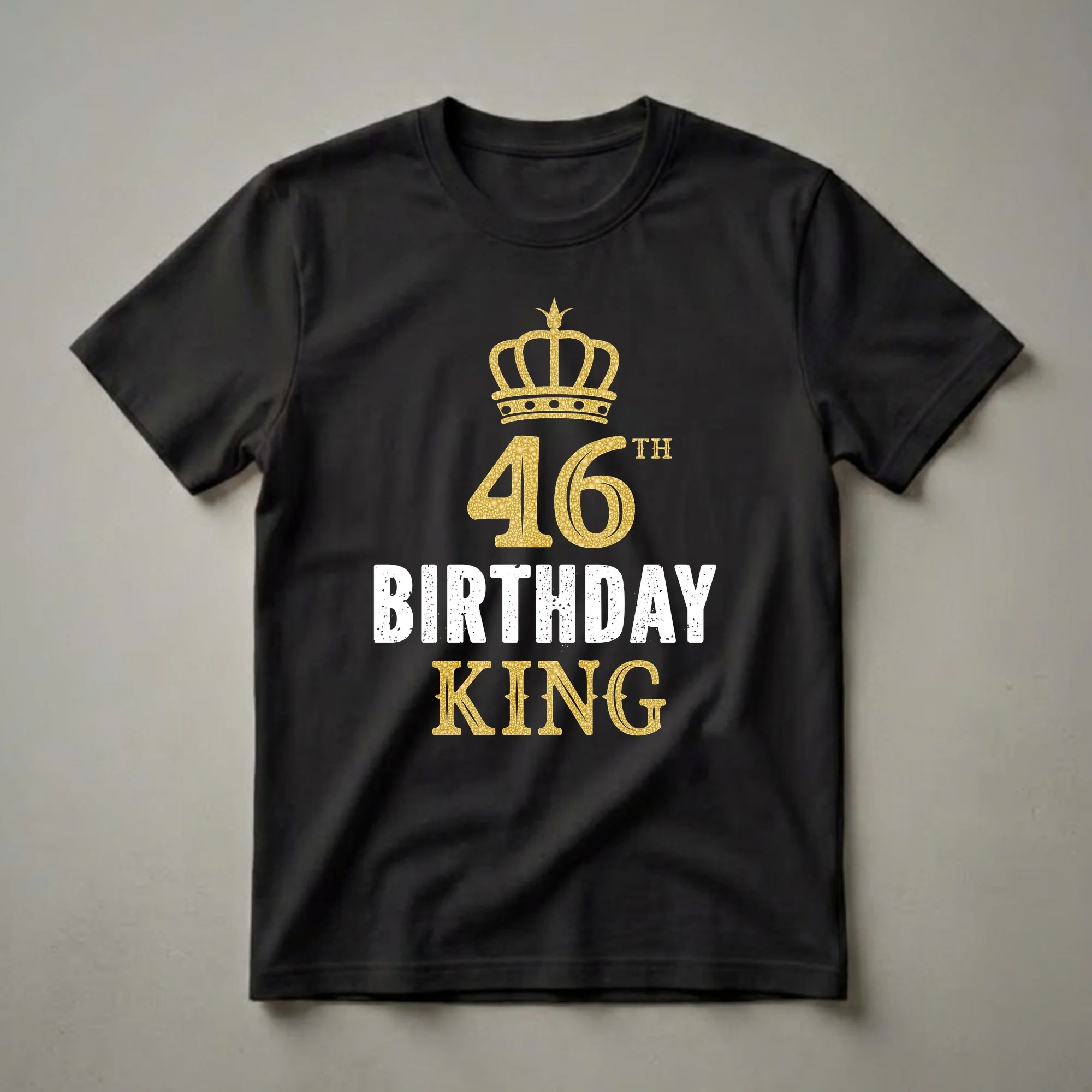 Men celebrating their 46th birthday can proudly wear their royal status with this striking graphic tee. The design prominently features a regal golden crown positioned above the number '46', rendered in a textured, bubbly gold effect. Below the age, the words 'BIRTHDAY' appear in distressed white block letters, followed by 'KING' in a matching textured gold font. This shirt is a fantastic way for any man turning 46 to mark the milestone. The 46th year is a significant point, often marking a transition into the latter half of one's 40s, a time for reflection and celebration. This t-shirt makes a thoughtful gift for a husband, father, brother, or friend who is reaching this special age. Imagine him wearing this at his birthday dinner or party, receiving compliments and well wishes. It's a comfortable and eye-catching piece of apparel that announces his special day with flair. This tee is a go-to for birthday celebrations and can be worn for years to come as a reminder of his 46th year.