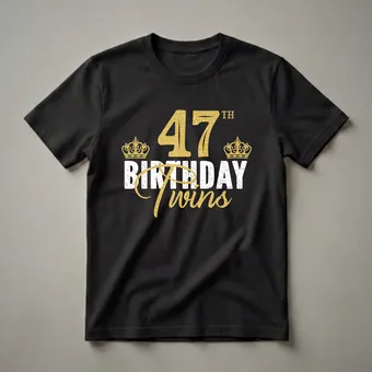 Twin siblings celebrating their 47th birthday will reach for this eye-catching graphic tee. The design prominently features the number '47' in a textured gold font, accompanied by the words 'BIRTHDAY TWINS' in distressed white lettering. Two ornate gold crowns adorn the sides, adding a regal touch to the celebratory theme. Turning 47 marks a significant milestone, often a time when individuals reflect on shared experiences and the unique bond of being twins. This shirt is a thoughtful gift for a twin brother and sister who want to commemorate their special day together. It's a great way for them to show off their twin pride at birthday gatherings, family events, or casual outings. The bold graphics and celebratory message make this t-shirt a standout piece for anyone marking their 47th year as part of a twin pair. This apparel is a fun way to acknowledge the shared journey of 47 years.