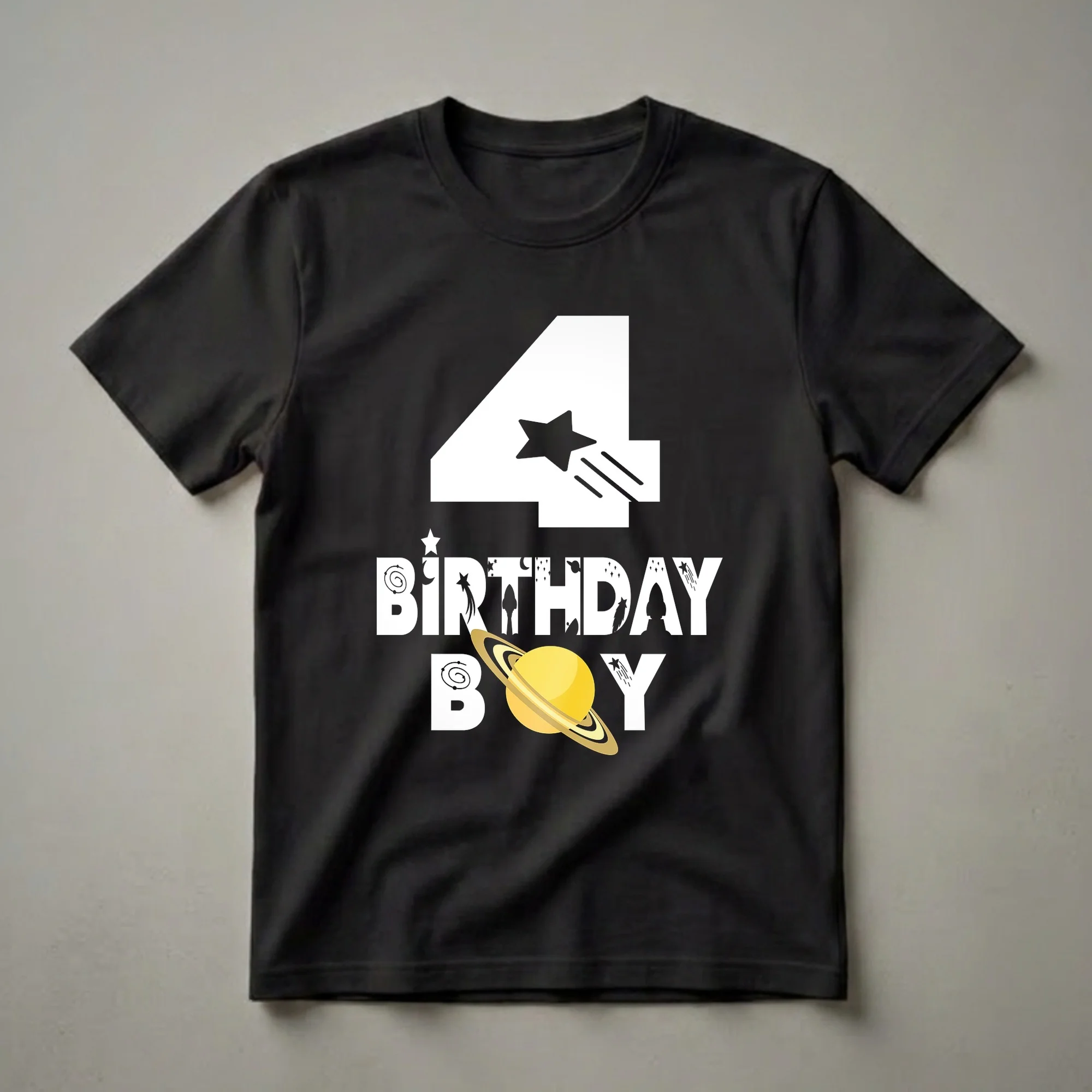 Four-year-old boys who dream of exploring the galaxy will love this vibrant birthday tee. The design prominently features a large white number '4' with a shooting star streaking across it, symbolizing a journey through the cosmos. Below, the words 'BIRTHDAY BOY' are presented in bold white lettering, interspersed with whimsical space elements. You can spot a detailed illustration of Saturn with its iconic rings, a silhouette of a rocket ship ready for launch, crescent moons, and scattered stars, all set against a black background that evokes the vastness of space. This shirt is a fantastic way for any young explorer to celebrate turning four. It's a thoughtful gift for a son, grandson, or nephew who is fascinated by astronauts, planets, and the mysteries of outer space. Imagine him wearing this eye-catching t-shirt to his birthday party, a trip to the science museum, or just for everyday play, sparking conversations about his cosmic adventures. This graphic tee is sure to become a favorite for any little astronaut-in-training.