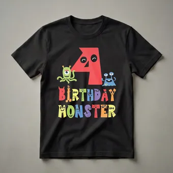 Turning four is a monstrously fun milestone, and this "Birthday Monster" t-shirt captures that excitement with a playful, alien-inspired design. The graphic features a large, friendly red number '4' with a smiling face, positioned above the words "BIRTHDAY MONSTER." Each letter in the phrase is uniquely styled and colored, resembling quirky monsters themselves. To the left of the '4' is a green, one-eyed alien creature with tentacles, while a blue, two-eyed alien with a wide grin stands to the right. These whimsical characters add to the theme, making this tee a hit for any child's special day. This shirt is a fantastic choice for the birthday boy or girl turning four, bringing a unique twist to their celebration. It makes a thoughtful gift for any parent looking for a fun and memorable present for their child's fourth birthday party. Imagine their delight when they unwrap this eye-catching shirt, ready to wear it for their big day or any casual outing. This graphic tee is sure to become a favorite, a thoughtful choice for a child who enjoys imaginative play and colorful characters.