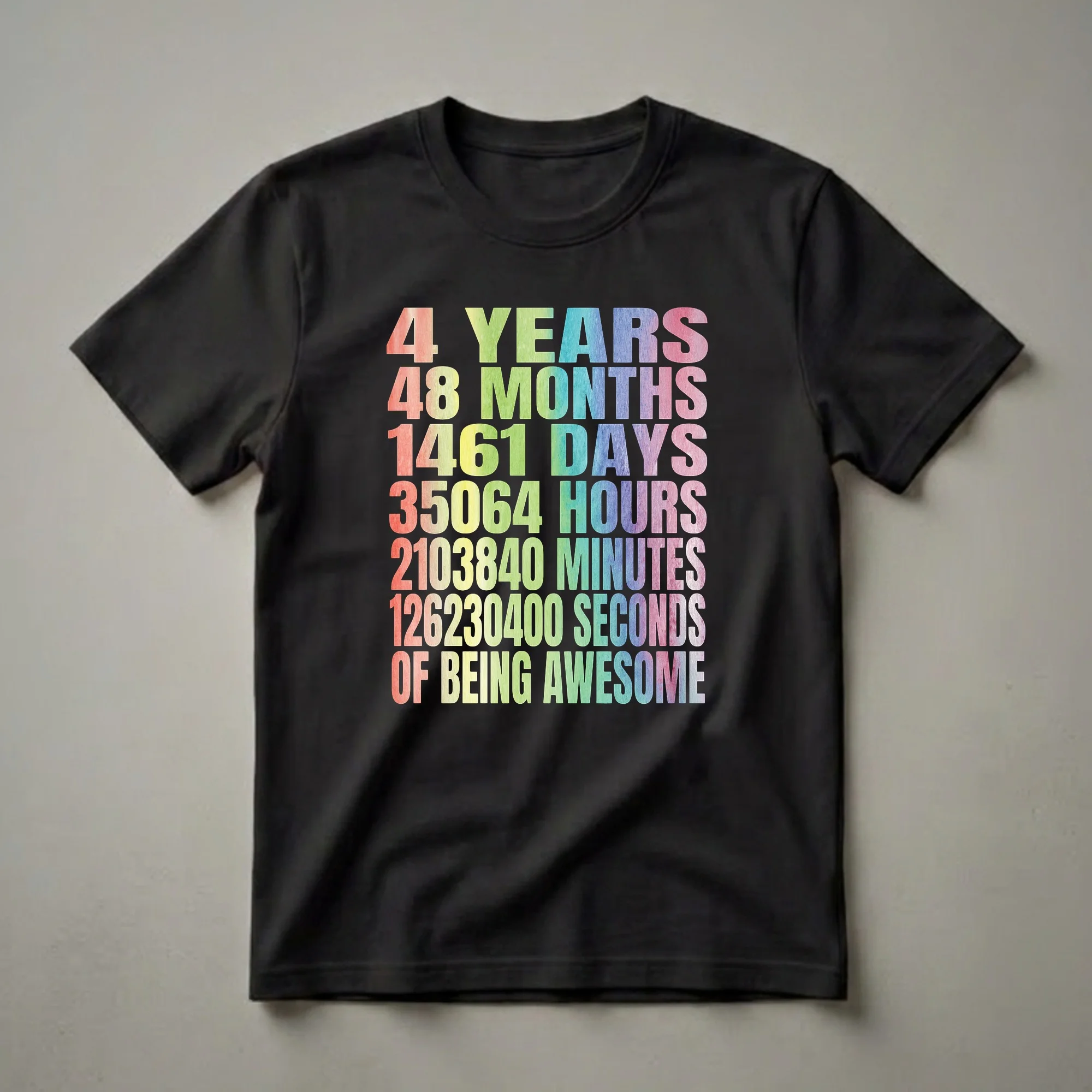 Four-year-olds are entering a vibrant stage of development, full of curiosity and energy. This graphic t-shirt captures that milestone by showcasing the impressive numbers that make up four years: 48 months, 1461 days, 35,064 hours, 2,103,840 minutes, and 126,230,400 seconds. The text is presented in a playful watercolor style, with a gradient of colors from red and orange to yellow, green, blue, and purple, making it visually engaging for young children. This shirt is a thoughtful gift for any child turning four, whether it's for a birthday party, a family gathering, or just because. It's a fun way for a 4-year-old to wear their age and celebrate their journey. This tee works well for a birthday celebration or as a casual outfit for a child who loves to show off their age. Parents and grandparents will appreciate this unique way to commemorate a special birthday. The vibrant colors and detailed breakdown of time make this shirt a standout piece for any little one's wardrobe. It's a fun conversation starter and a memorable keepsake for a child's fourth birthday.