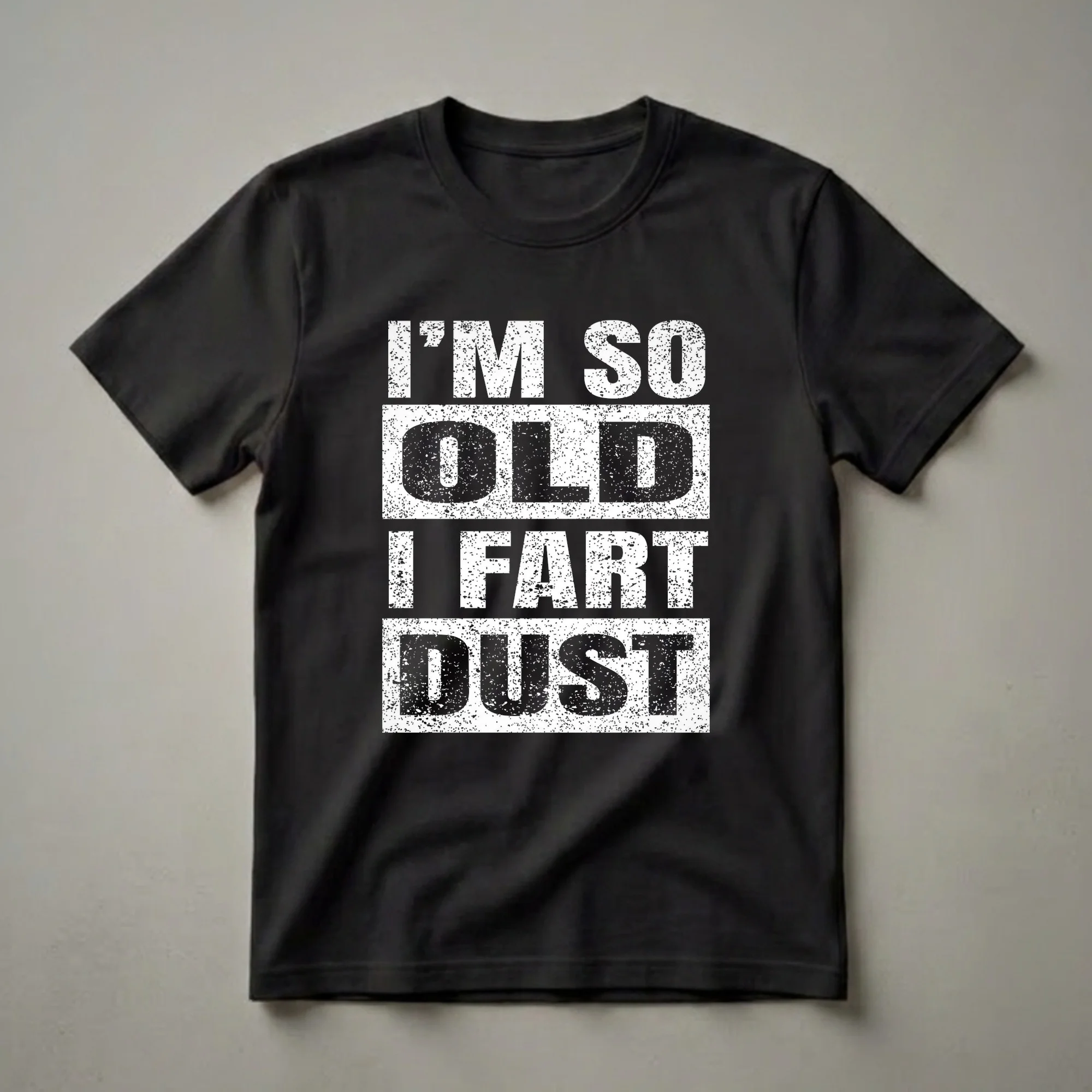 - Features the funny saying 'I'm So Old I Fart Dust' in distressed print.
