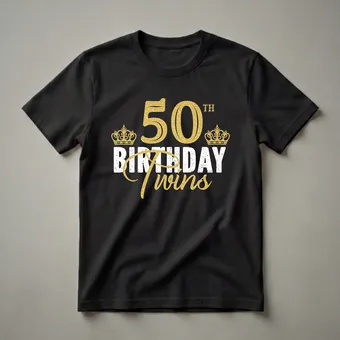 Turning fifty is a significant milestone, and this "50th Birthday Twins" shirt is a fantastic way for a twin brother and sister to celebrate together. The design features bold, textured gold lettering for "50th" and "Birthday Twins," accented by ornate gold crowns on either side. The number 50 is rendered in a shimmering, granular gold texture, making it truly eye-catching. Below, "Birthday Twins" is presented in a distressed white font, creating a striking contrast against the black background of the shirt. This tee is a thoughtful gift for any pair of twins hitting this golden age, great to wear to a joint birthday party, family gathering, or a special celebratory brunch. It’s a wearable memento of their shared journey through five decades. This shirt is a go-to tee for celebrating this momentous occasion, symbolizing their unique bond as they enter a new chapter together. The combination of regal crowns and celebratory text makes this a standout piece for any twin celebrating their 50th year.