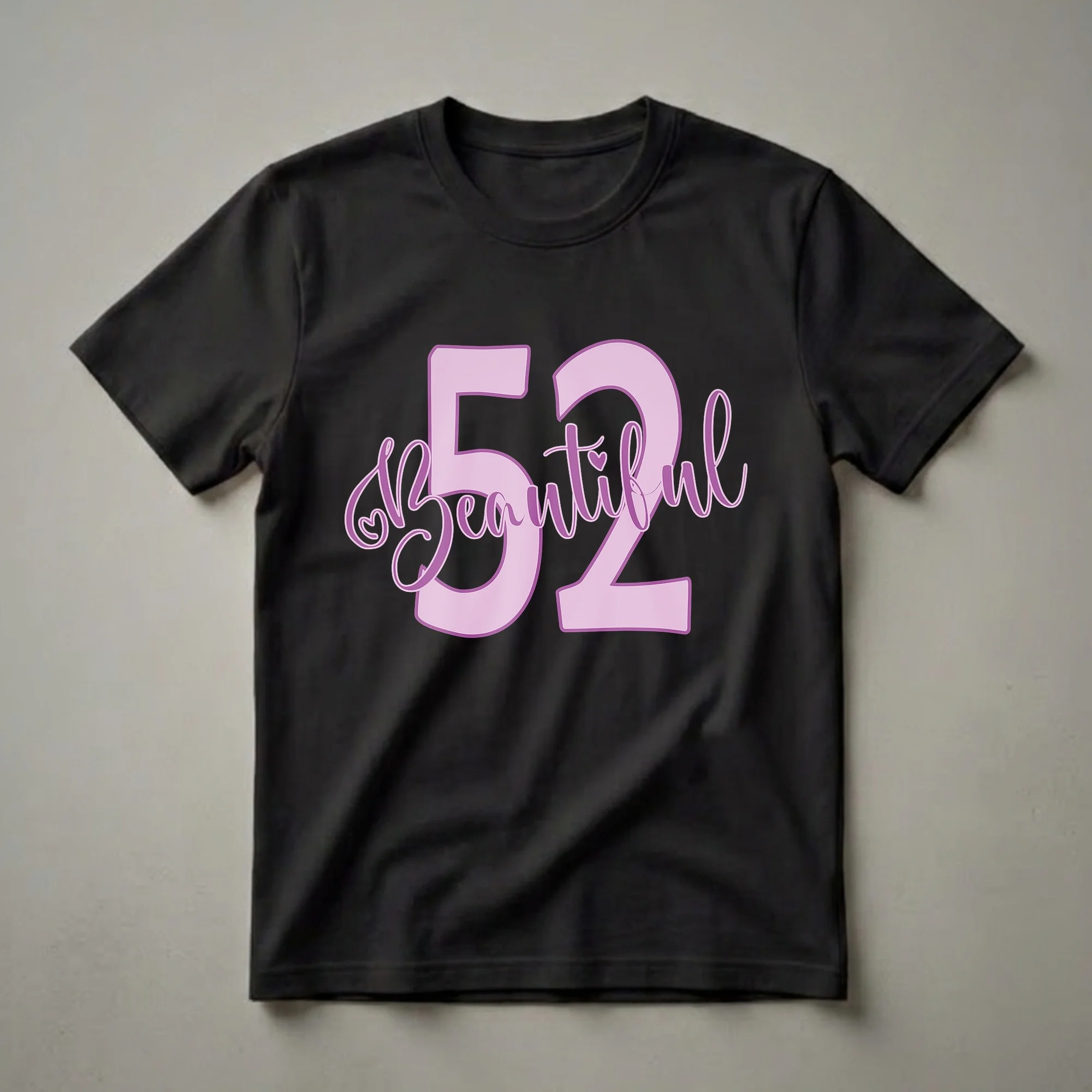 Celebrate fifty-two years with this 'Beautiful' birthday graphic tee, featuring elegant script and sweet heart details. The design prominently features the number '52' in bold, light pink lettering with a contrasting darker pink outline. Overlaying the numerals is the word 'Beautiful' rendered in an elegant, flowing cursive script, also in a darker pink hue. Subtle heart accents are woven into the lettering, adding a touch of charm and affection. This shirt is a wonderful way for any woman turning 52 to express her joy and confidence on her special day. It makes a thoughtful gift for a mother, wife, sister, or friend who is marking this significant milestone. Imagine her wearing this comfortable t-shirt to a birthday brunch, a casual get-together with loved ones, or simply while enjoying her day. The design is a celebration of reaching 52 years with grace and beauty, making it a memorable piece of apparel for the birthday girl. This shirt is a staple in any birthday collection for women.