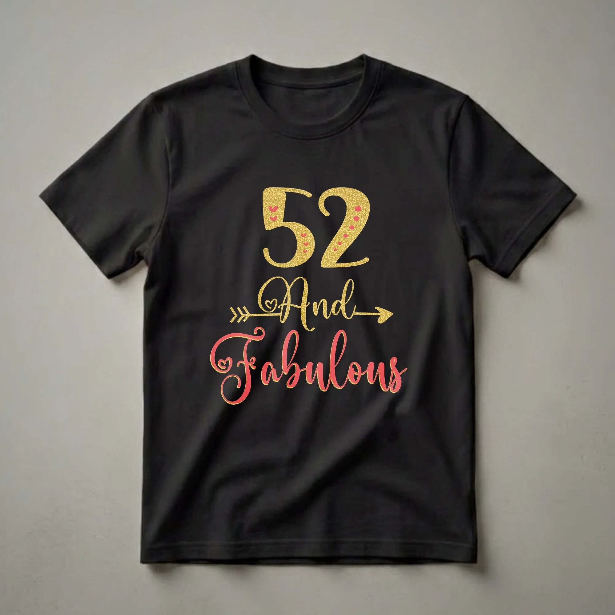 Women celebrating their 52nd birthday will reach for this '52 And Fabulous' graphic tee. The design features the number 52 in a shimmering gold glitter texture, adorned with small red hearts and dots. Below it, the word 'And' appears in a matching gold glitter font, accented by a decorative arrow. The centerpiece of the design is the word 'Fabulous' written in a vibrant coral script, also with a glitter finish and outlined in gold, with a small heart accent. This t-shirt is a celebratory statement piece for any woman turning 52. It's a thoughtful gift for a wife, mother, or friend who embraces this significant birthday with style and confidence. Wear this shirt to birthday parties, family gatherings, or a special brunch to showcase your fabulous spirit. The combination of gold and coral creates an eye-catching look that’s both festive and chic, making it a go-to tee for birthday celebrations and beyond.