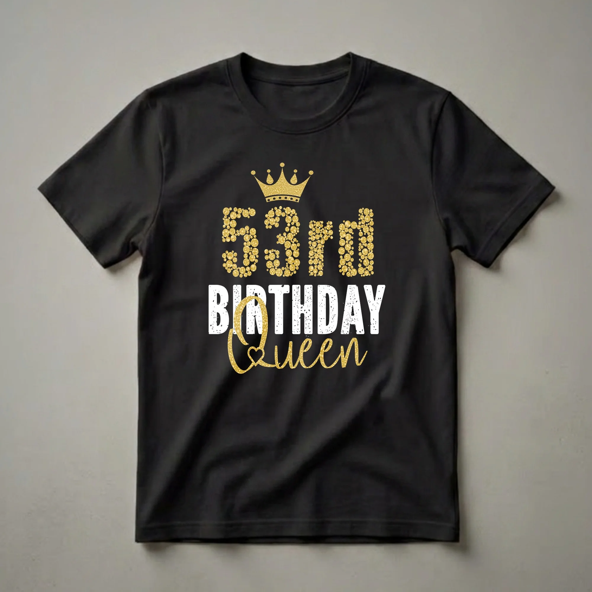 Fifty-three is a significant milestone, marking a period of established wisdom and continued vibrancy. This '53rd Birthday Queen' t-shirt is suited for women embracing this chapter with confidence and style. The striking graphic features the number '53' rendered in a dazzling gold glitter effect, topped with an ornate gold crown, symbolizing royalty and celebration. Below, 'BIRTHDAY QUEEN' is emblazoned in a distressed white font, with 'QUEEN' written in a flowing, glittery gold script that incorporates a heart shape. This eye-catching tee is a fantastic way for the birthday girl to express her celebratory spirit. It's a thoughtful gift for any woman turning 53, whether it's for a milestone birthday party, a family gathering, or just a special treat. She will reach for this shirt to wear to her birthday brunch or any occasion where she wants to feel like the queen she is. This shirt is a perfect way to commemorate 53 years of life and achievements, making her feel celebrated and cherished on her special day. It's more than just apparel; it's a statement piece for a woman who knows her worth and is ready to shine.